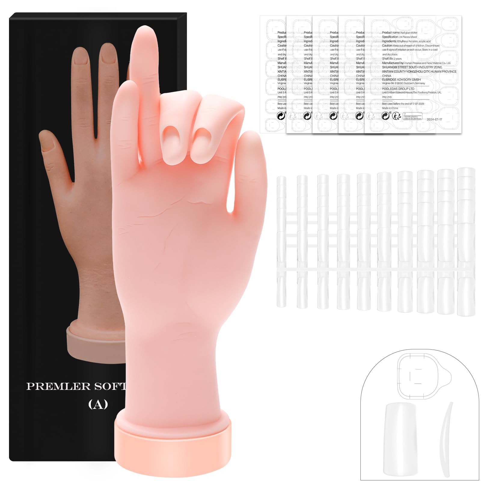 Zhaoyao Practice Hand for Acrylic Nails, Nail Practice Hand with 100 Pcs Nail Tips 120 Pcs Double-side Jelly Glue Stickers Bendable Fake Hand
