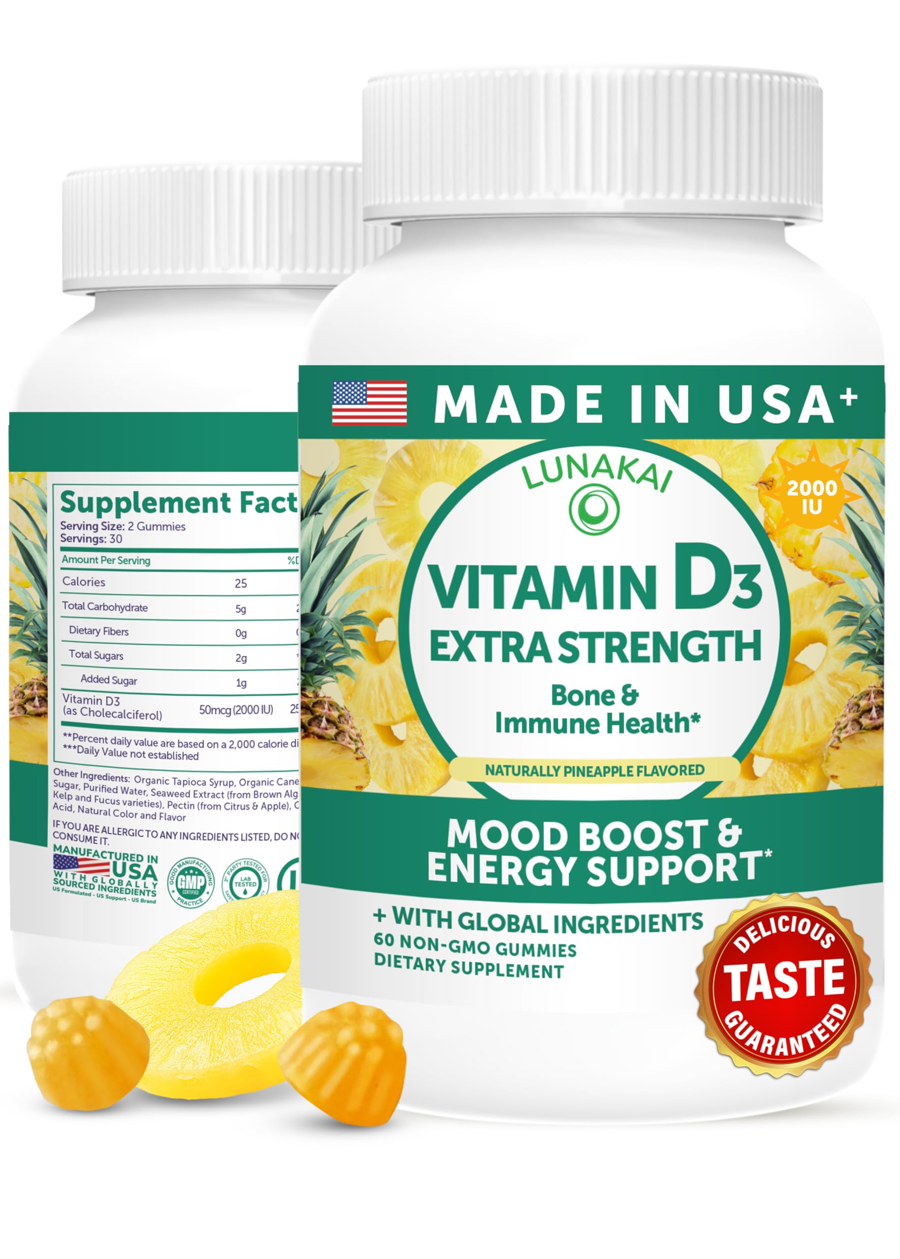 Lunakai USA Made Vitamin D3 Gummies 2000 IU - Non-GMO, Gluten-Free Vitamin D Gummies for Women & Men - Bone, Immune & Energy Support, 60ct