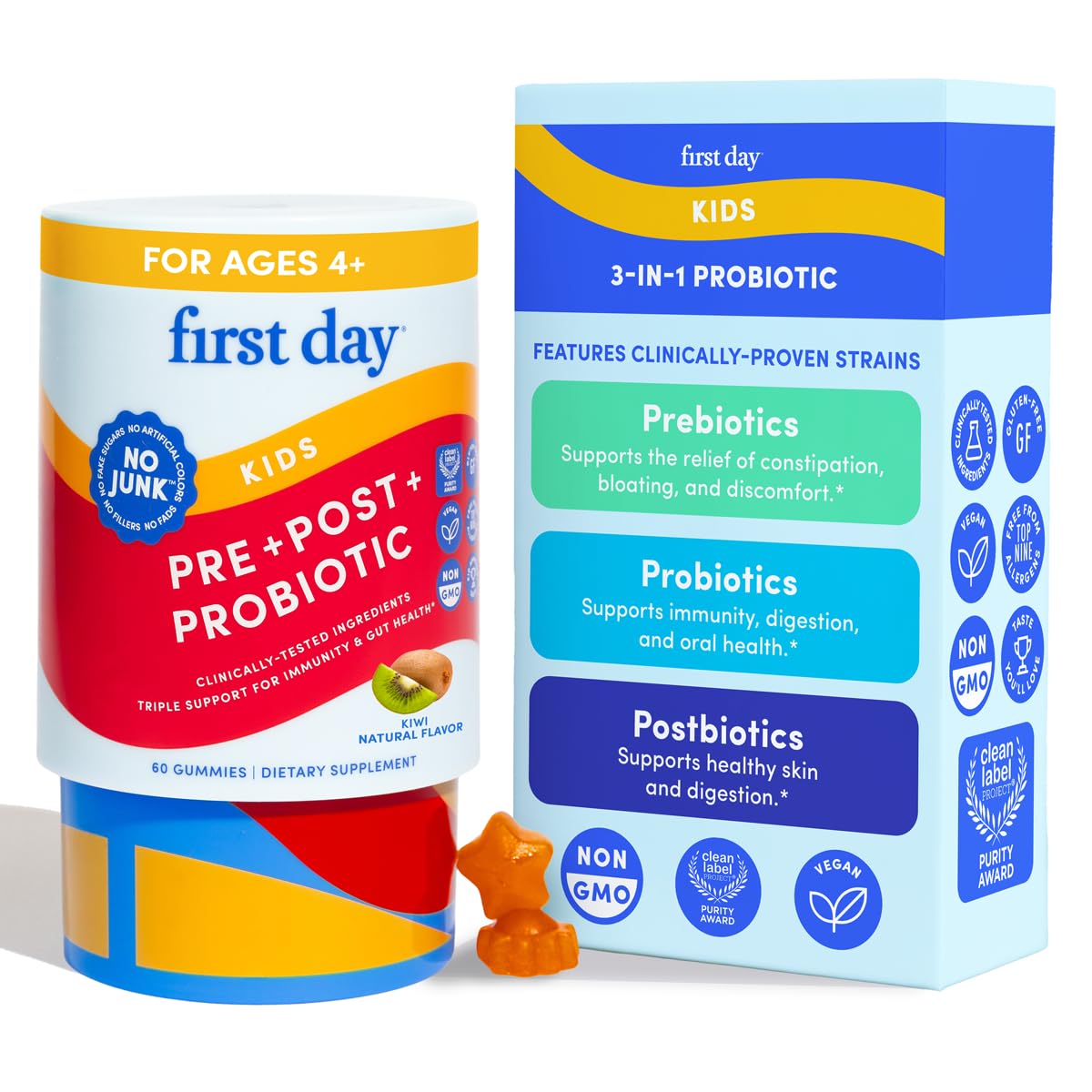 FIRST DAY Kids 3-in-1 Probiotic Gummies β Prebiotic + Probiotic + Postbiotic Supplement β Supports Digestive & Oral Health, Immune Function & Energy