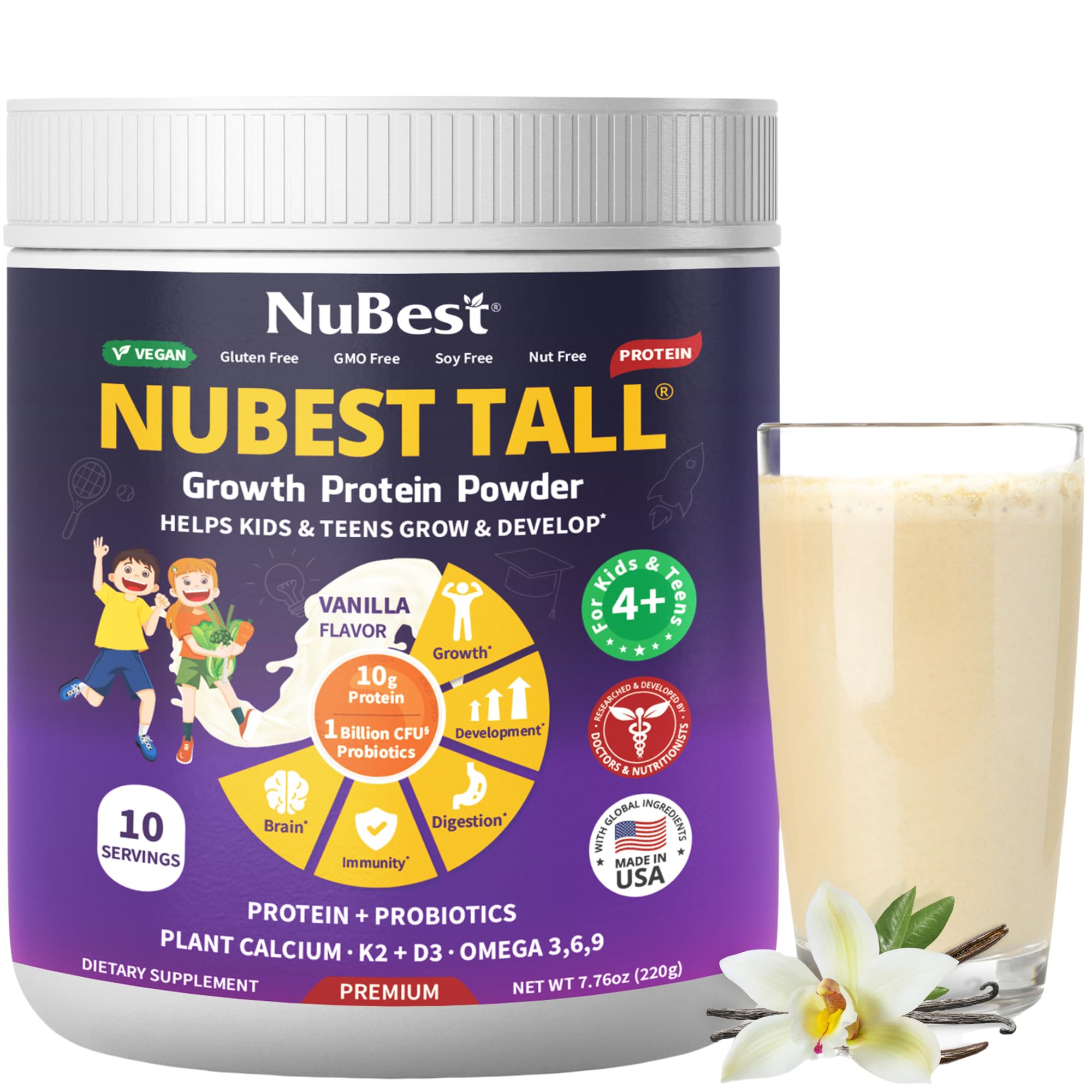 NuBest Tall Vanilla Plant-Based Protein Powder for Kids & Teens - Healthy & Immunity with Probiotics, Omega 3-6-9, Vitamin D3 + K2, Calcium & Vitamins