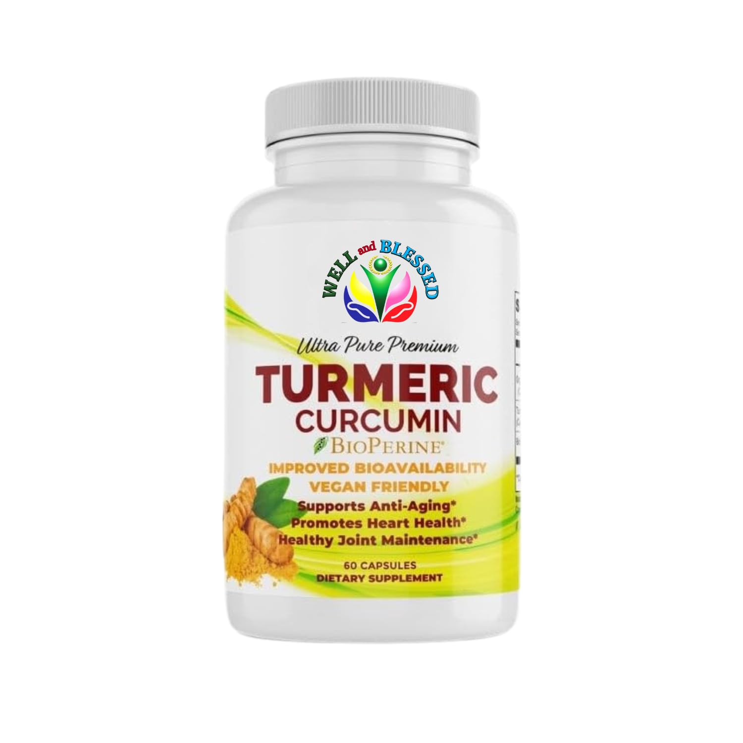 Well and Blessed Turmeric Curcumin Supplement with BioPerine - 60 Capsules - Organic Turmeric Root Extract - Vegan Friendly, Enhanced Absorption,