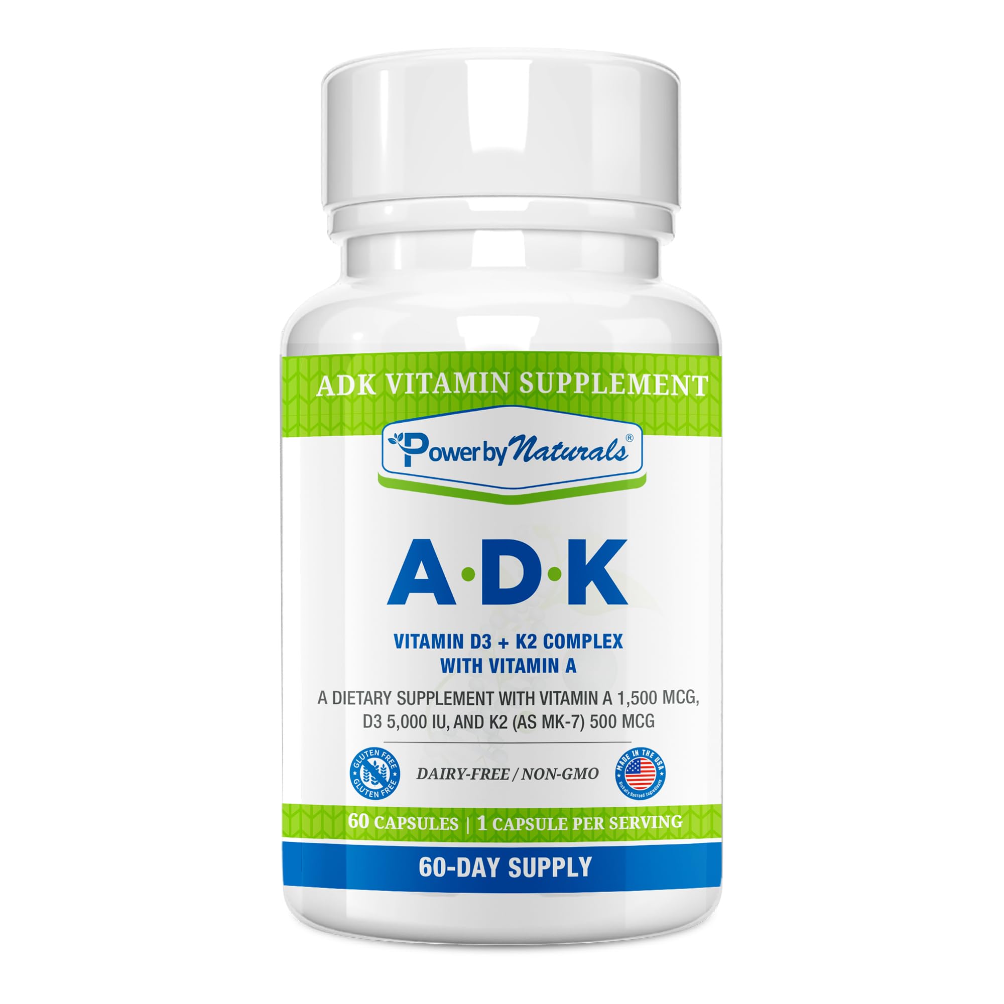 Power By Naturals ADK Vitamin Supplement – Vitamins A, D3 & K2 MK-7 for Bone Health & Calcium Absorption – Gluten-Free, Soy-Free – 60 Capsules (2-