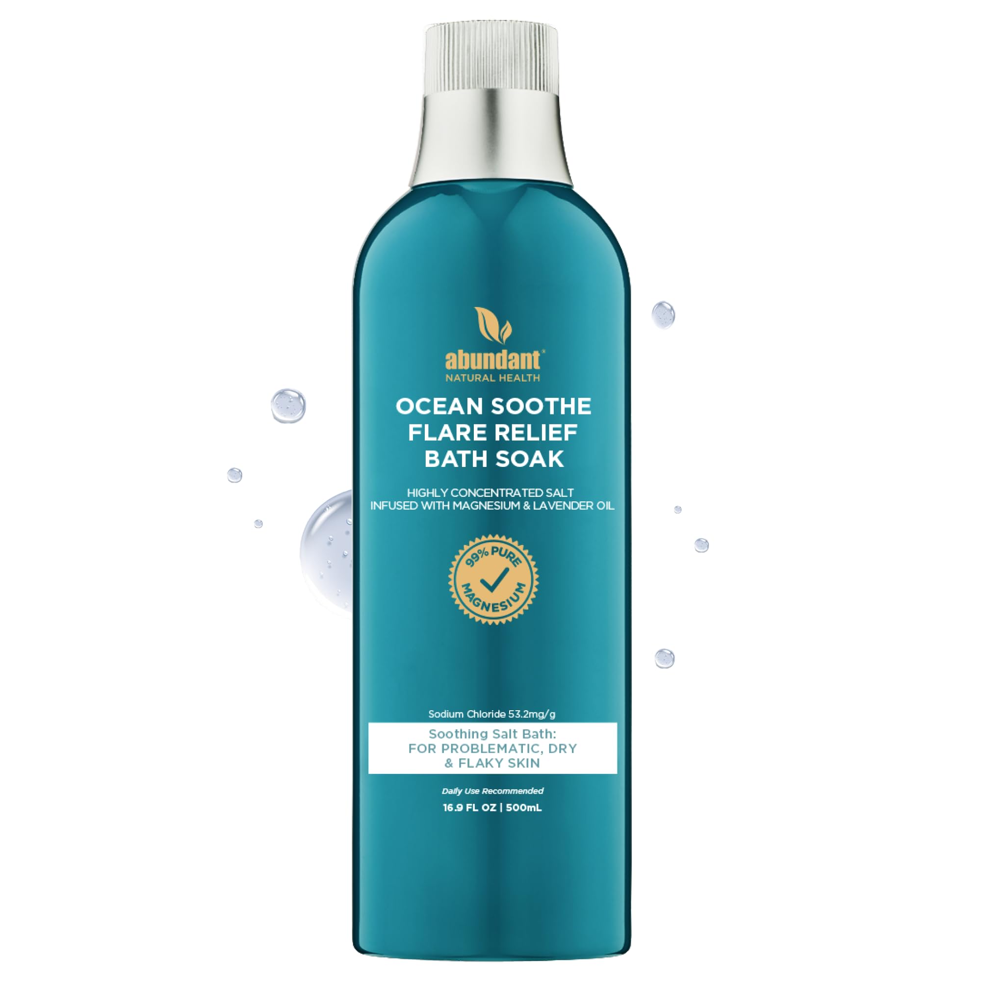 OCEAN SOOTHE FLARE RELIEF BATH SOAK leave your dry and flaky skin feeling moisturized and soothed with this deeply calming bath soak. Formulated with highly concentrated 99% pure magnesium salt and lavender oil to enhance hydration and promote skin regeneration ULTRA HYDRATION with our formula speci