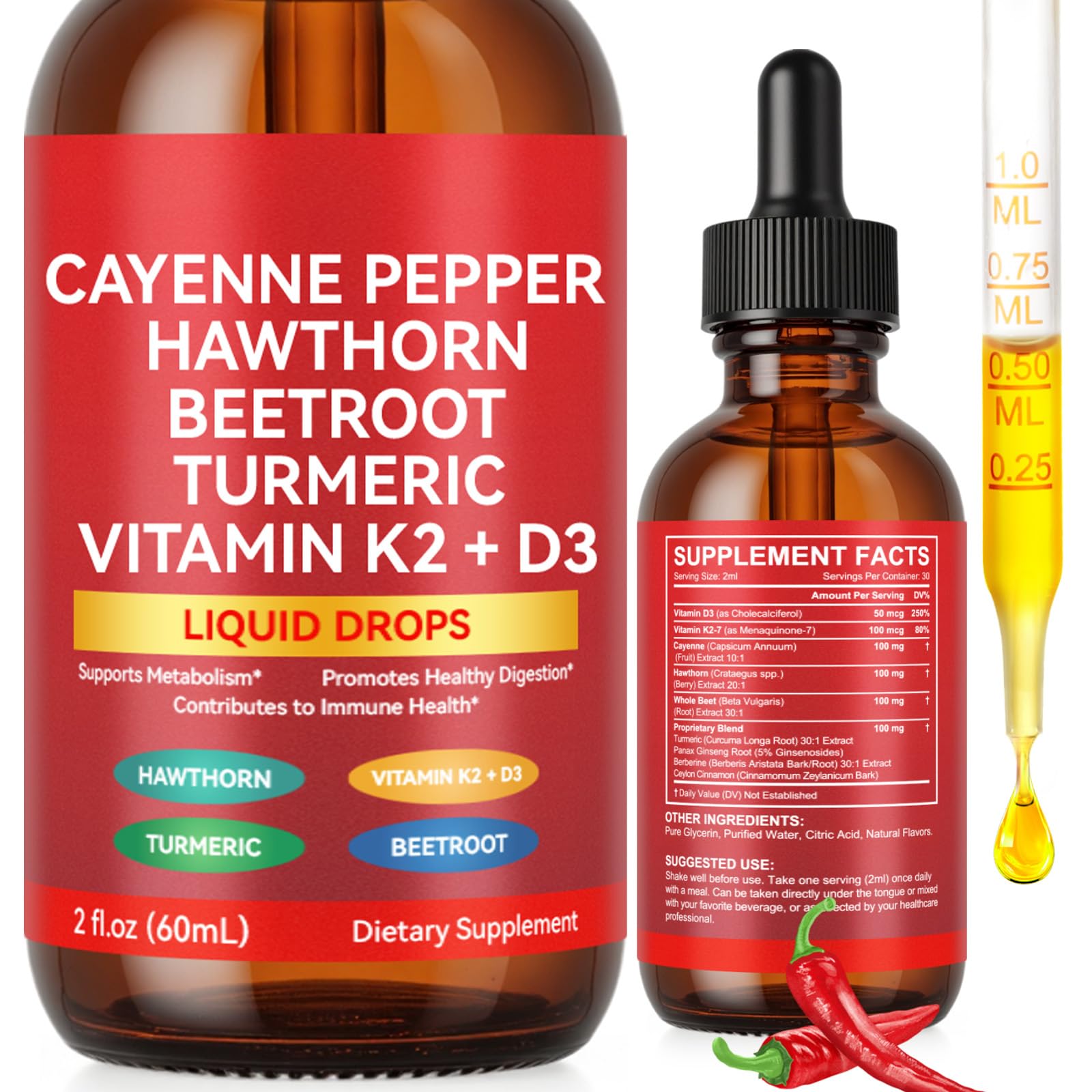 Cayenne Pepper Drops Supplement Liquid with Hawthorn Berry, Vitamin D3 K2 Beet Root Powder, Ceylon Cinnamon, Turmeric Curcumin, Organic Panax Ginseng,