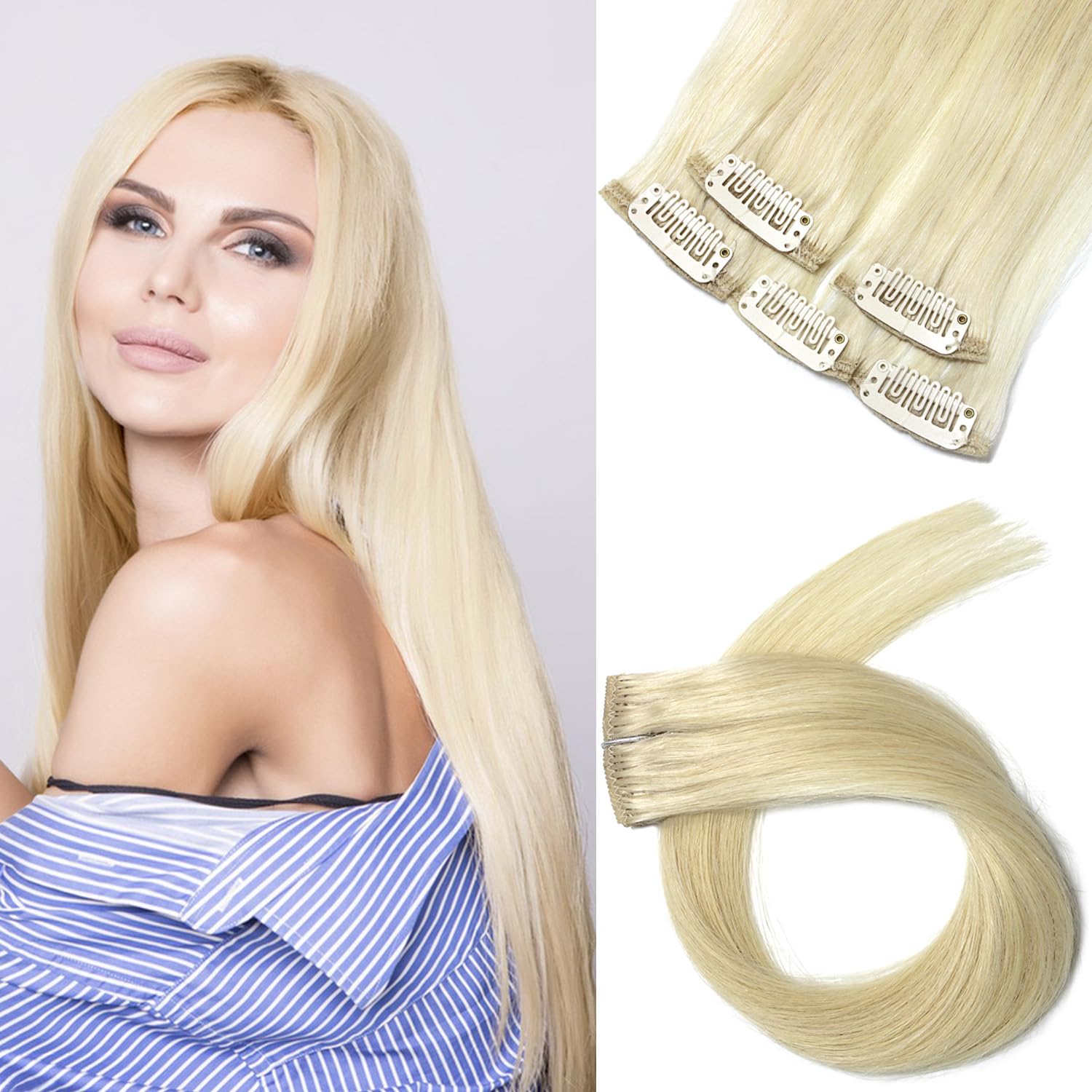 Clip In Hair Extensions Human Hair Light Platinum Blonde Highlights Remy Hair Extensions 18 Inch for Women Girls 5PCS #60