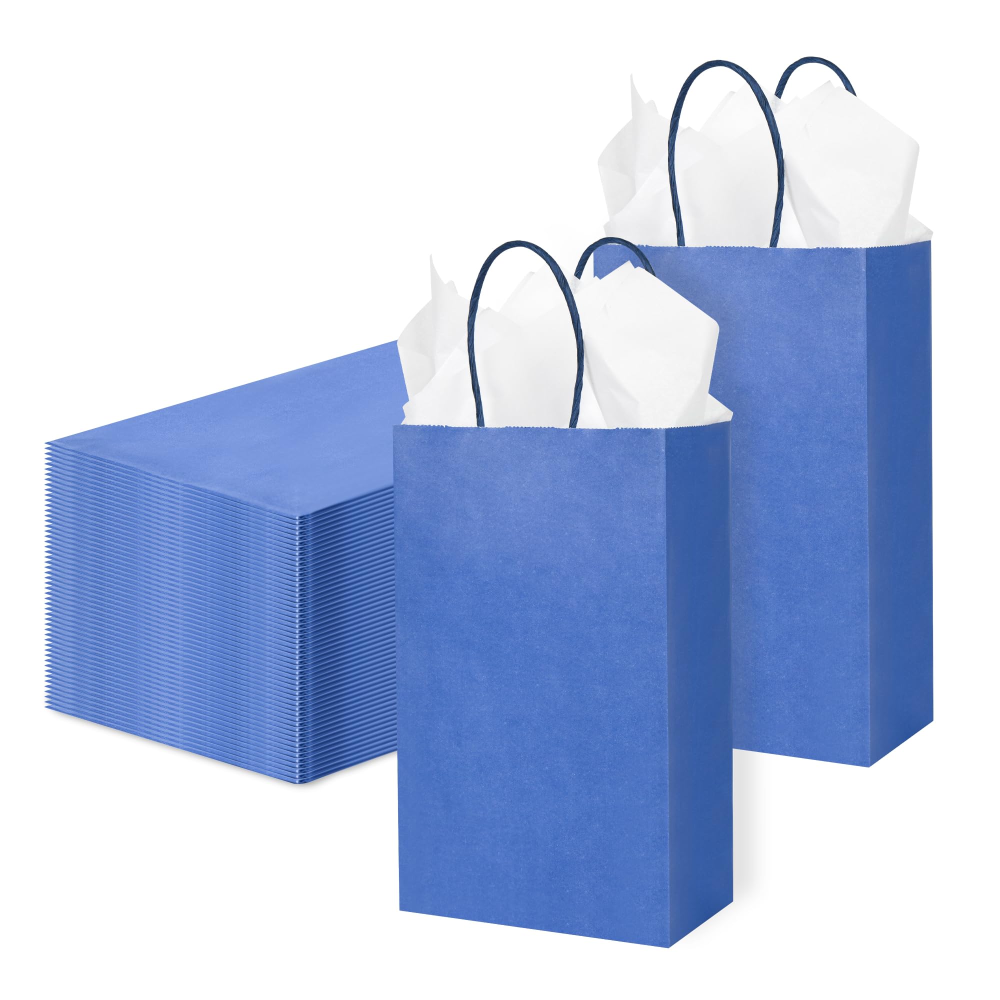 WHAT'S INCLUDED: The value bulk set includes 100 pack small-sized navy blue paper bags with handles for party favors, business gifts, merchandises GIFT BAG SIZE: Each navy blue paper gift bag with handles for boutique measures 5.5'' length by 9'' tall by 3.15'' deep (5.5''W x 9''H x 3.25''D) NAVY GI