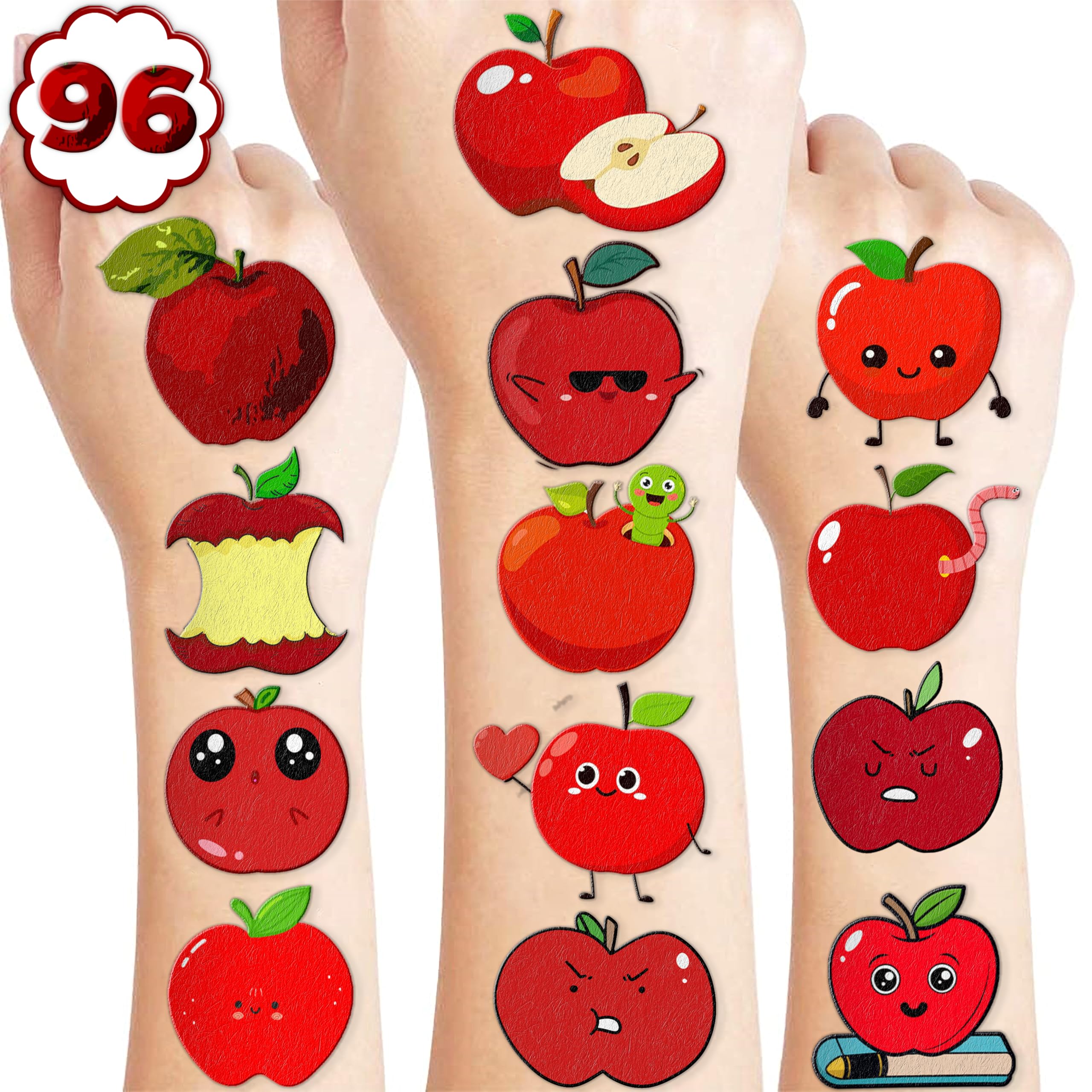 Pattern rich: Red Apple Cute Fruit Back To School Classroom Temporary Tattoos include 10 Sheets 100 PCS, the size of each sheet is 6.1 * 3.1 inches. Easy to share,even if a lot of people's parties, you can have a different tattoo with others.These adorable tattoos will keep you and your little ones