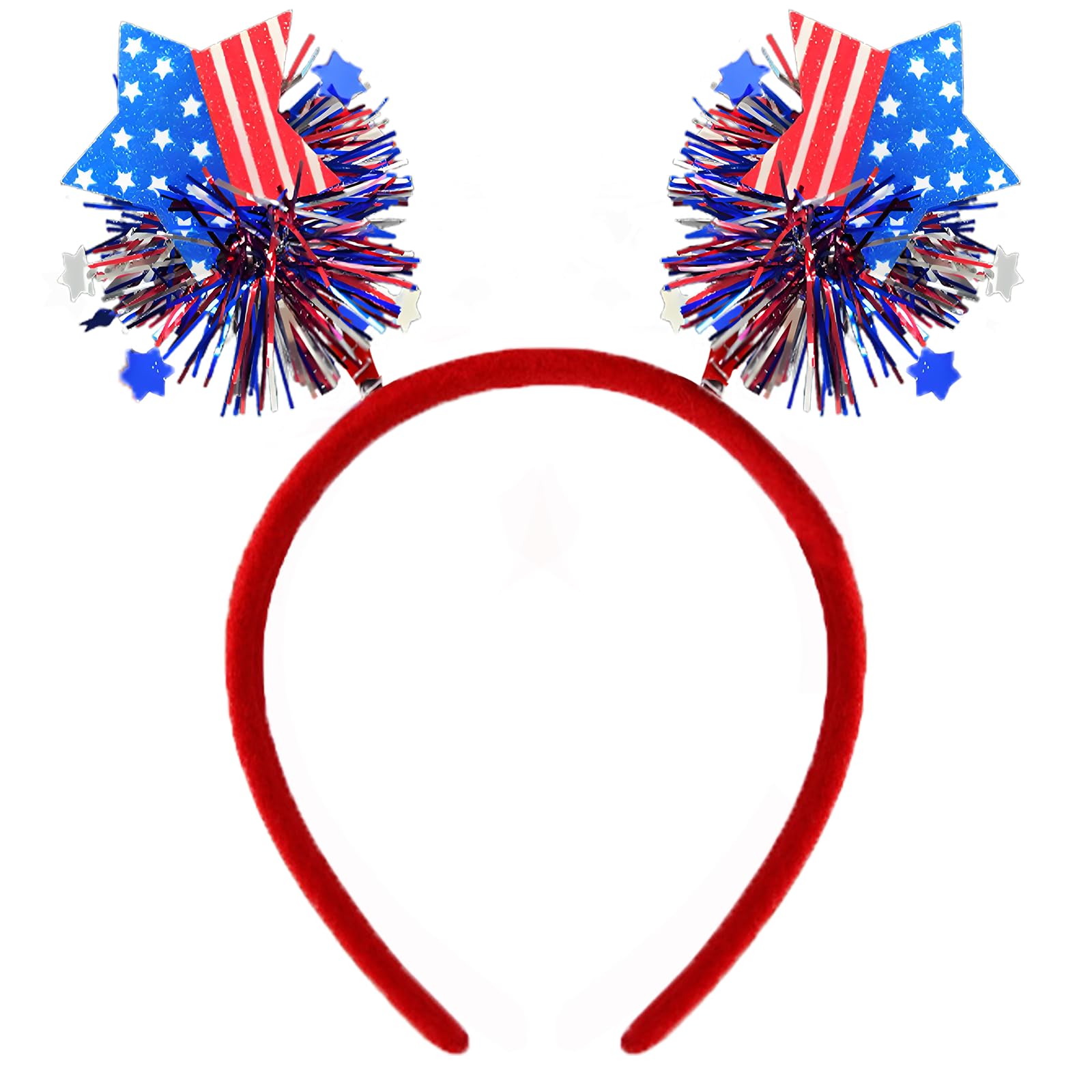 PATRIOTIC STAR HEADBAND: This headband features two vibrant star boppers with red, white, and blue tinsel, securely attached to a plastic base covered in soft fabric for a comfortable and stylish look. LIGHTWEIGHT & COMFORTABLE: The fabric-covered plastic headband ensures a snug yet comfortable fit,