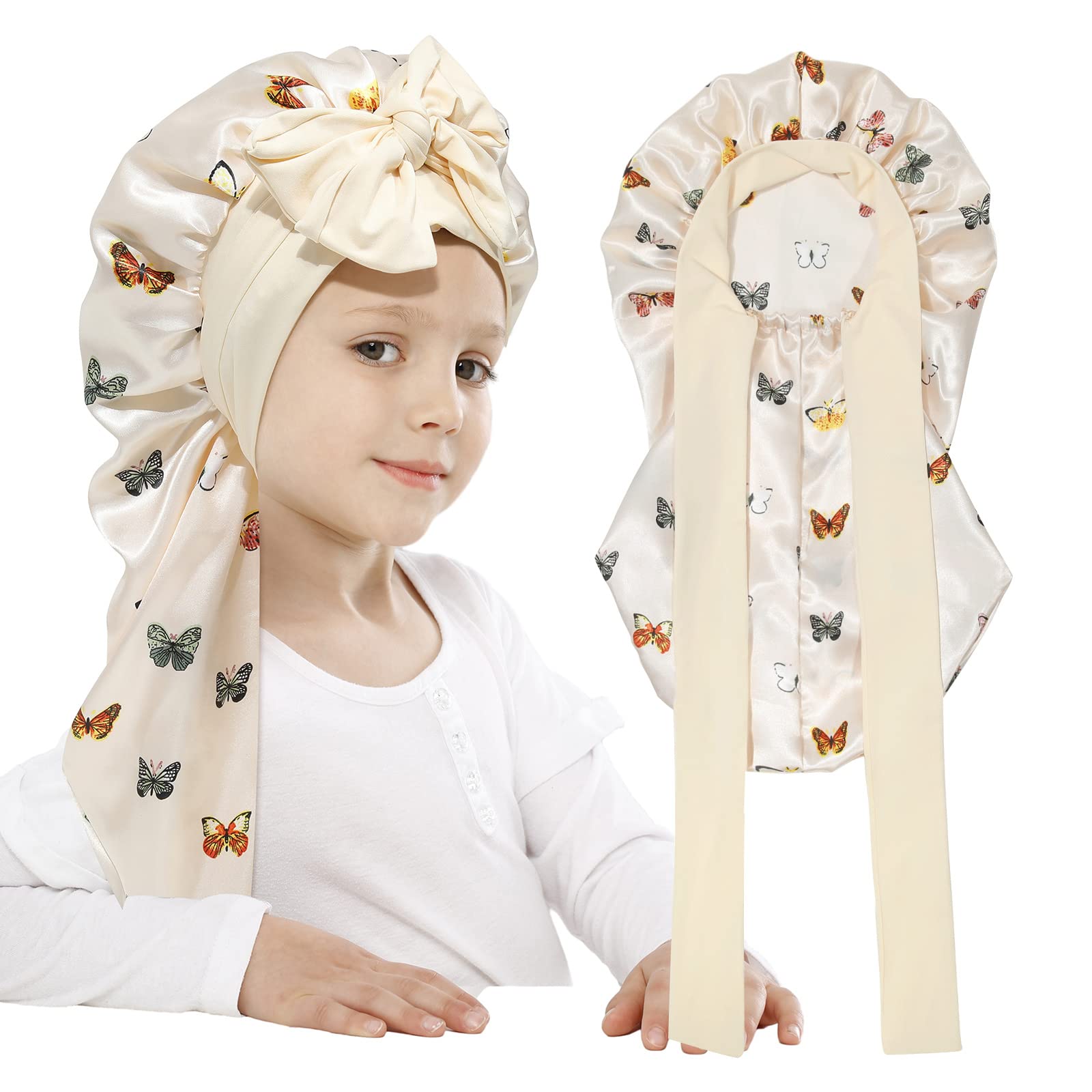 AWAYTR Long Toddler Silk Bonnet for Sleeping Elastic Satin Bonnets for Curly Hair Braid Night Cap for Aged 3-12 Kids (Butterfly+Beige)