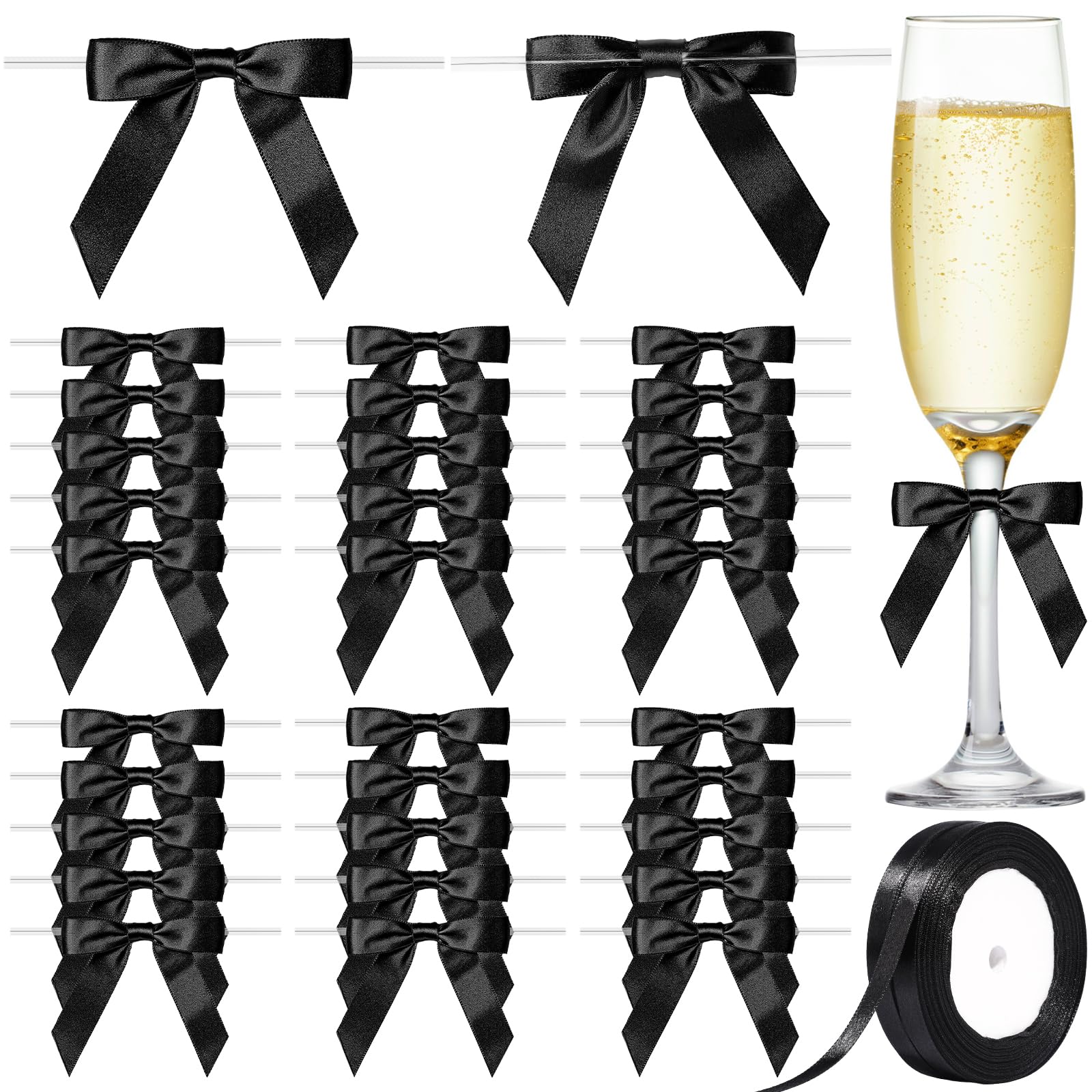 Black Bows Set This black bows set includes 30 pre-tied black satin bows with clear twist ties and 2 rolls of matching black satin ribbon (20 yards each). The ribbon bows kit make your party decor, crafts, and packaging look polished and professional. Small Black Bow Measuring approximately 2.5x2.5