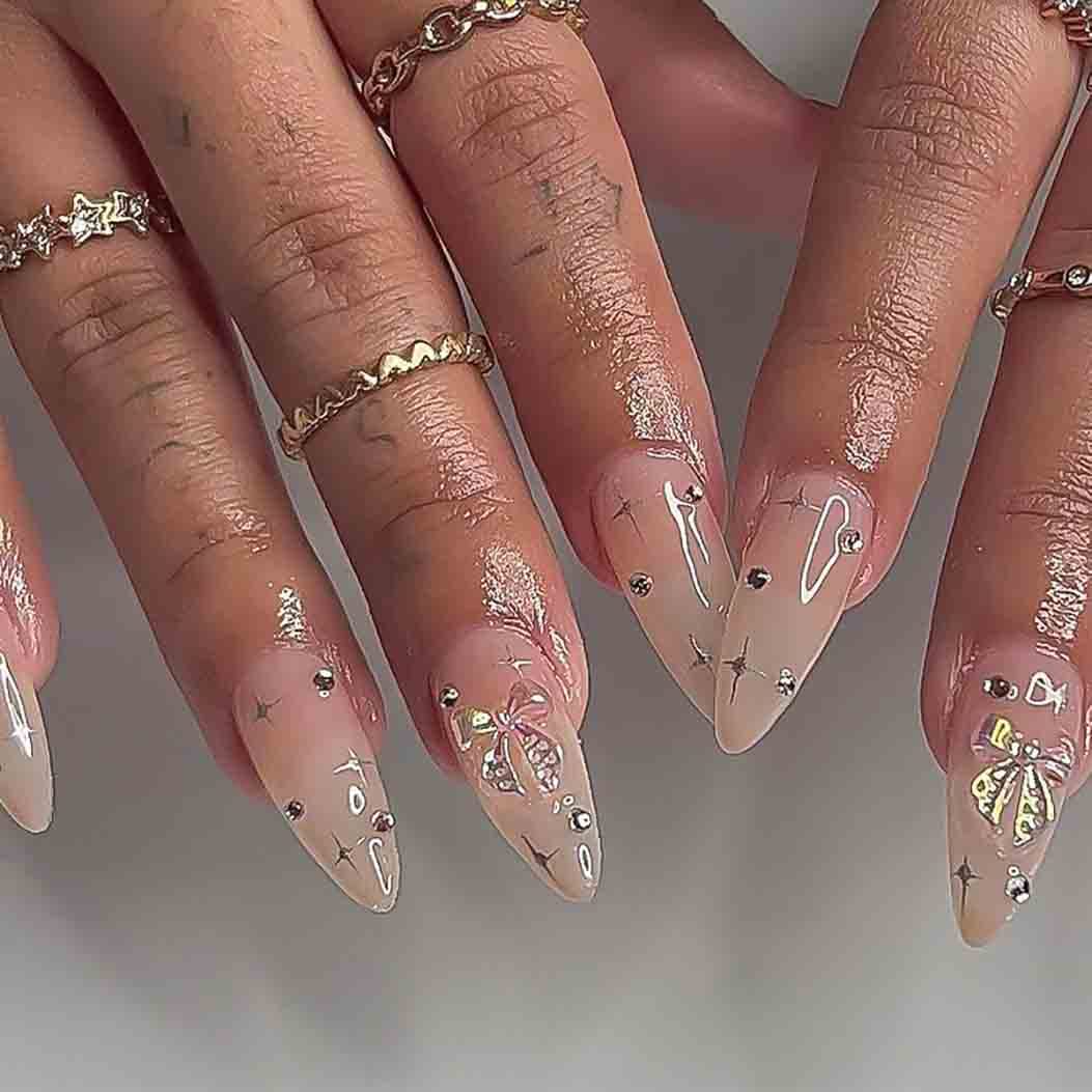 RikView Medium Press On Almond Acrylic Nails - Nude with Rhinestones, Glossy Full Cover - 24 PCs