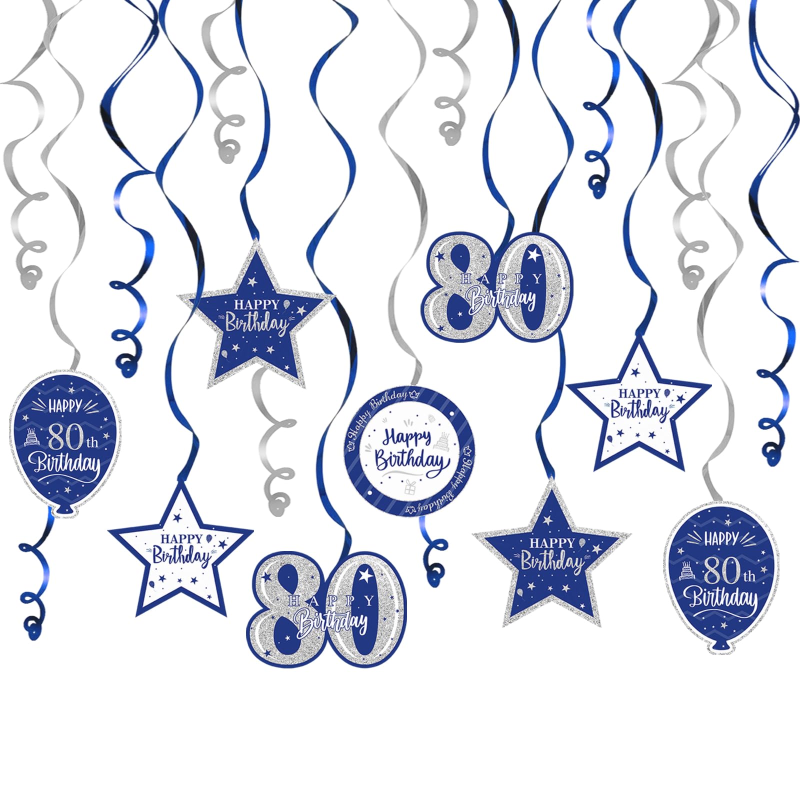 Nelbiirth Happy 80th Birthday Blue & Silver Glitter Swirls Streamers Party Decorations - 15 Pcs 80th Birthday Hanging Swirls Streamers Kit,Cheers to