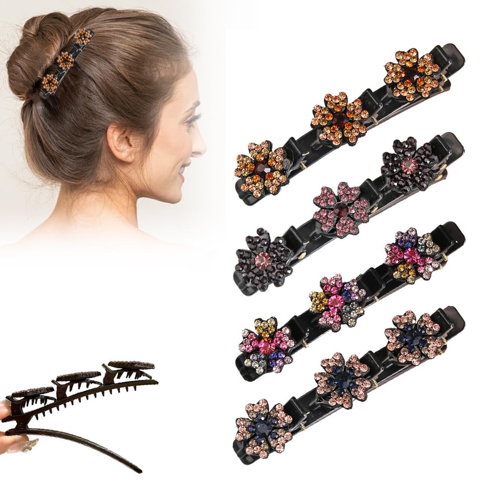 Moonboat Sparkling Crystal Stone Braided Hair Clips, 4pcs Set - Women's Modern Floral Hair Clips for All Hair Types - Wedding, Bachelorette Party,
