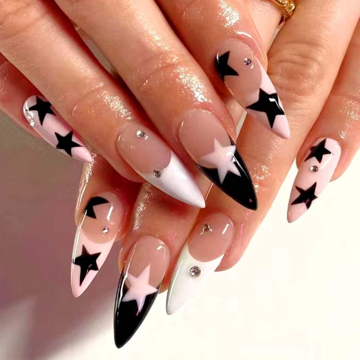 Star Press on Nails French Tip Fake Nails Medium Almond False Nails Press ons with Designs Cute Acrylic Artificial Nails Full Cover Glue on Nails