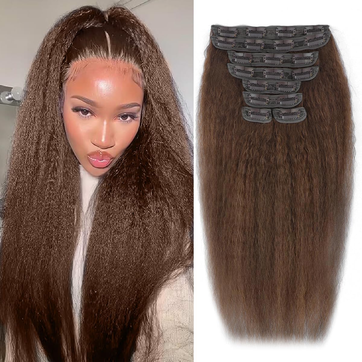 【Great Clip in Hair Extensions Real Human Hair Material】:Chocolate Brown Kinky Straight Human Hair Clip in Extensions Has Chosen 100% High-Quality Brazilian Virgin Hair from Young Girls. No Tangling or Shedding, Soft as Natural Hair, Odorless, Delicate Texture, Healthy Ends, Silky and Glossy.