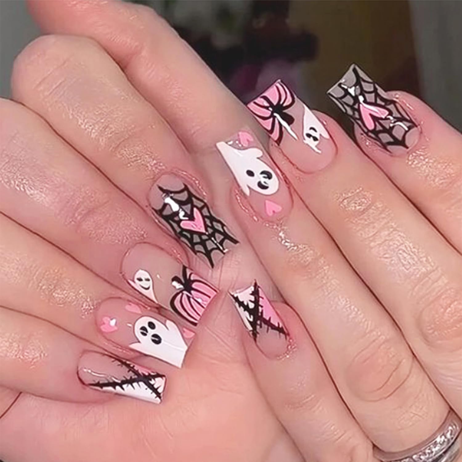 Halloween Nails Set :24Pcs Halloween Cute Press on Nails +1 Nail File + 24Pcs Jelly Glue Stickers+1 Wooden Stick.Durability of jelly glue is not as good as liquid glue, but it makes pumpkin fake nails reusable Material:These pink Halloween fake nails are made of ABS material, no irritating smell, hi