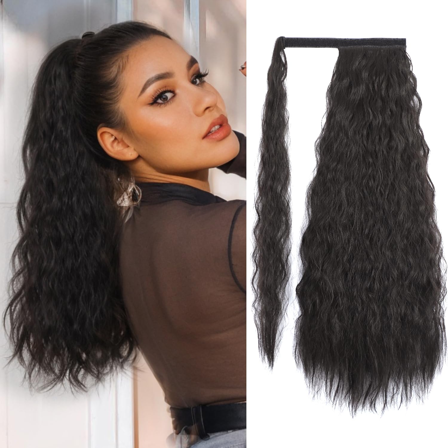 Stamped Glorious Long Corn Wave Ponytail Extension Magic Paste Heat Resistant Wavy Synthetic Wrap Around Ponytail Black Hairpiece for Women (22inch,