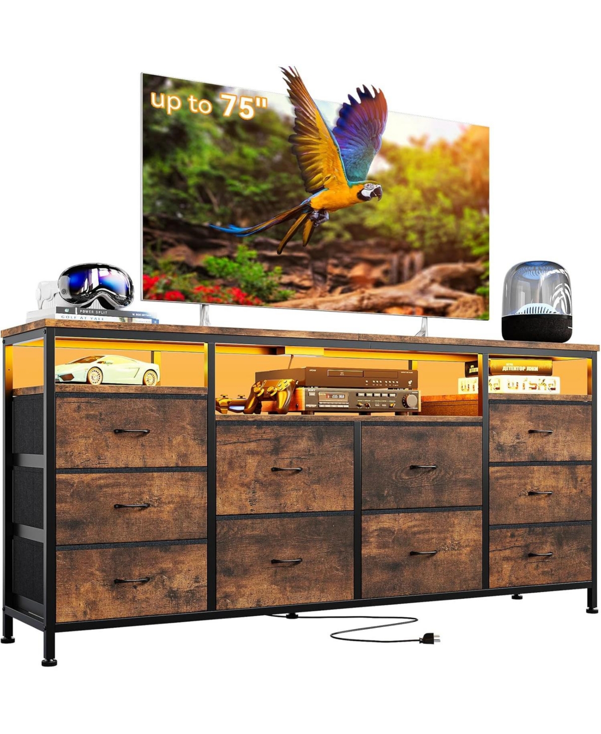 The Perfect Tv Companion! Say goodbye to clutter! This dresser Tv stand helps you keep your room organized with easy access to your media collection. Store everything from DVDs to remote controls in one convenient location, designed to support screens up to 75 inches, making it the ideal choice for