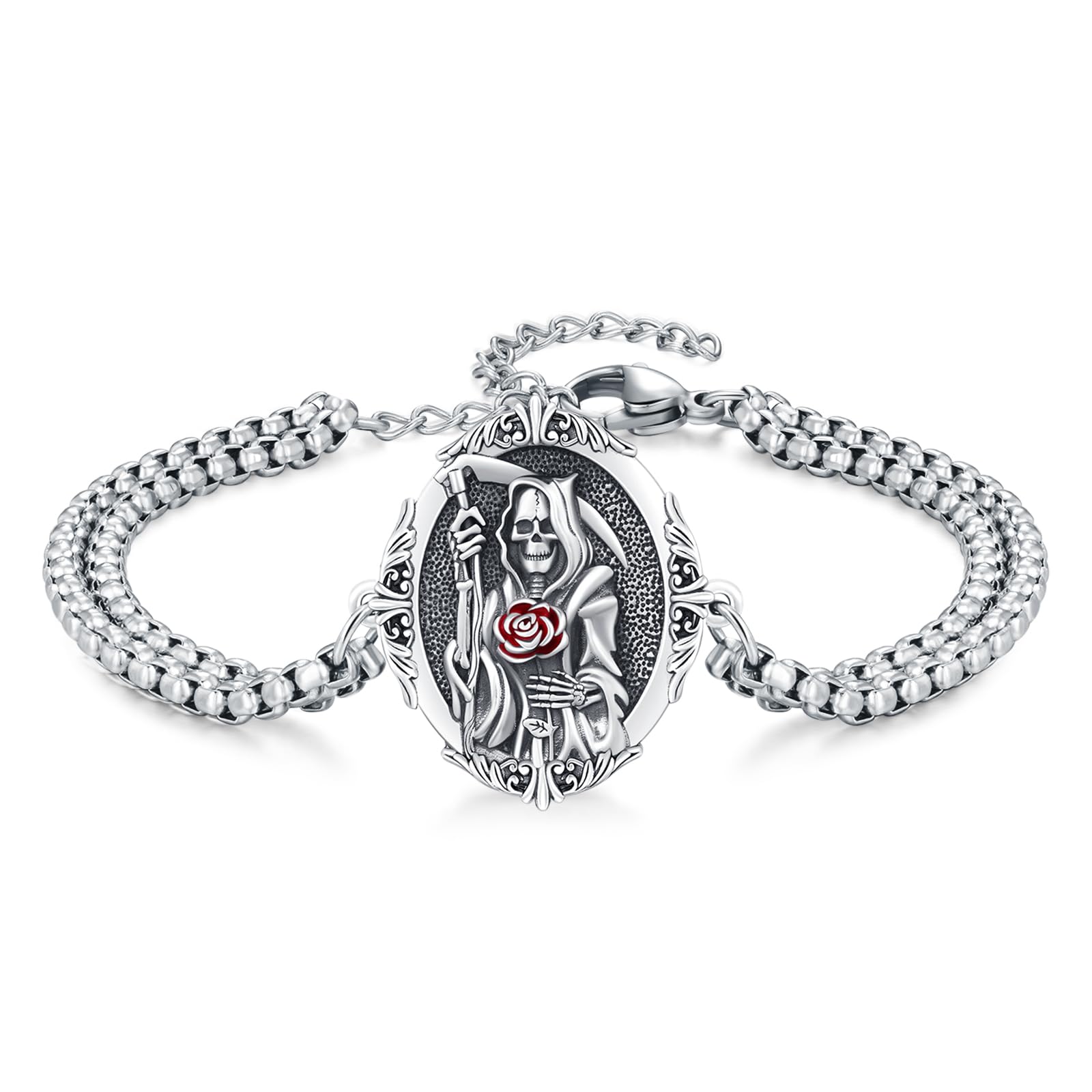 Santa Muerte Bracelet: Santa Muerte represents health and the soul's safe arrival in the afterlife. The frame of the Santa Muerte pendant has a special design, giving a sense of mystery, and the back is engraved with"Santa Muerte Perdoname Specifications:Santa Muerte bracelet is made of 925 sterling