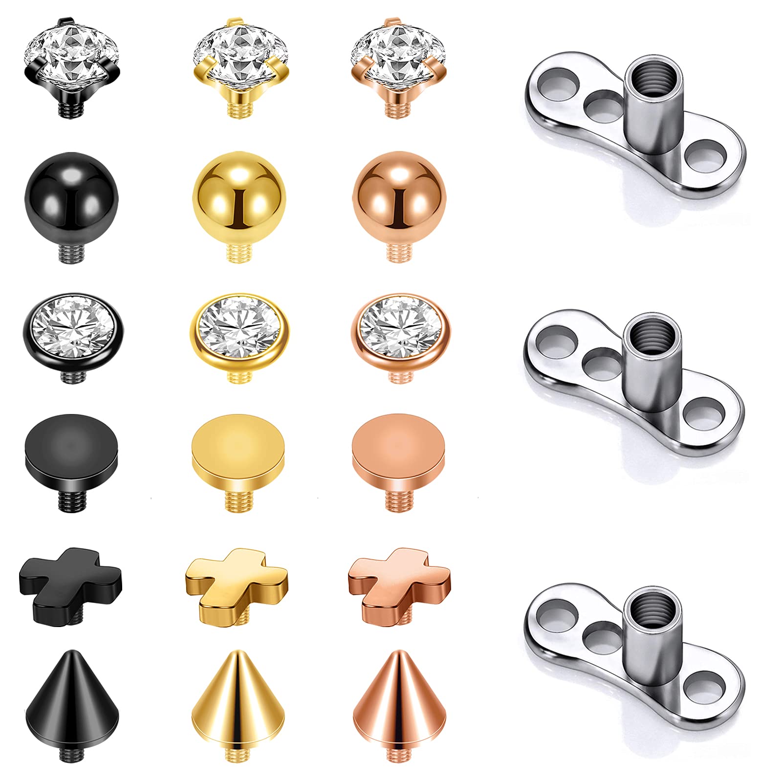 ❀VALUE FASHION DERMAL PIERCINGS SET——One Order Includes 14/15 Pieces Different Styles Dermal Anchor Tops and 3 Pieces Dermal Anchor Base, Each on is Different and Unique, Give Enough Choices for You to Suit Your Different Daily Wearing, Make You be Unique and Attractive Everyday. ❀MATERIAL