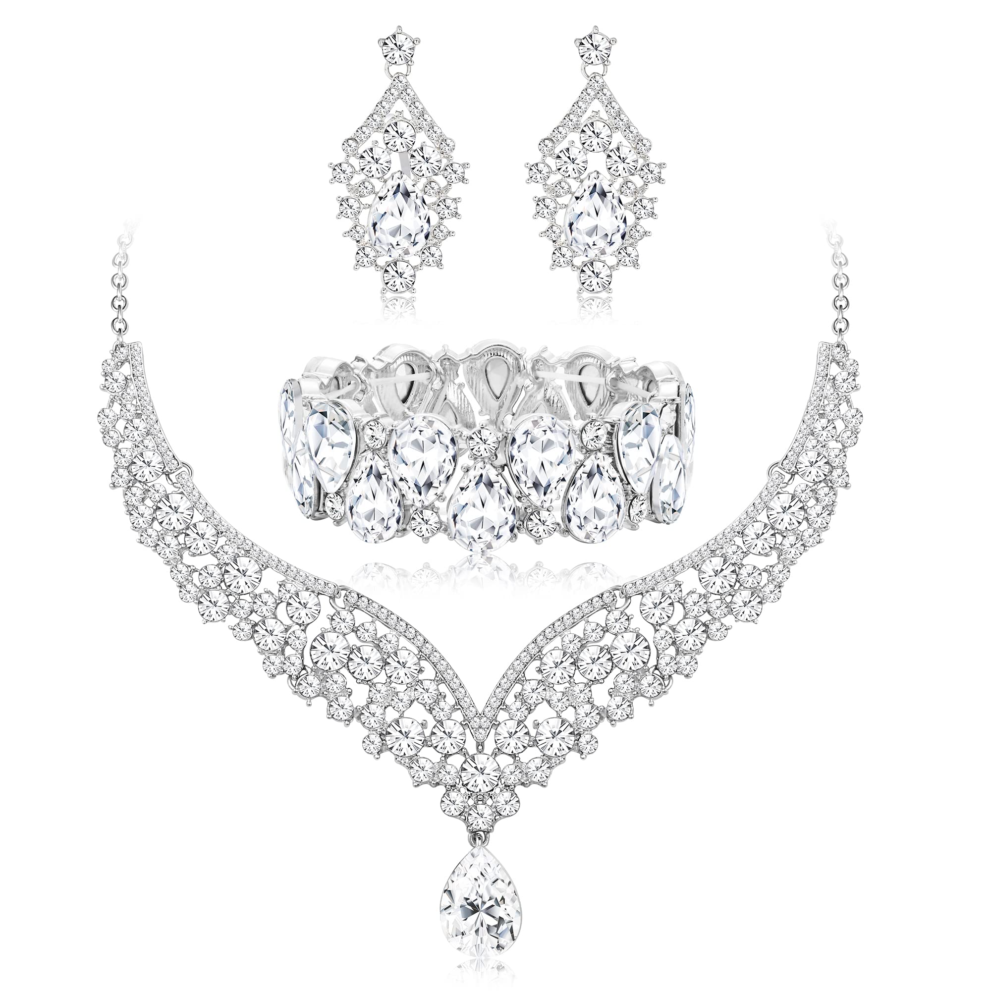 IRONBOX Crystal Wedding Bridal Jewelry Set for Women Prom Sliver Rhinestone Teardrop Necklace Earrings Bracelet Wedding Bridesmaid Gifts Fit with
