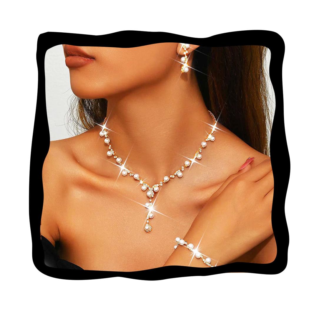 Pearl necklaces set for women are made of crystal, rhinestones and alloy for women bridal accessories. Rhinestone bridal jewelry sets for wedding package include: 1 necklace, 2 earring and 1 bracelet . Prom necklace bracelet sets are sparkly and Wedding accessories for brides make you charming and a
