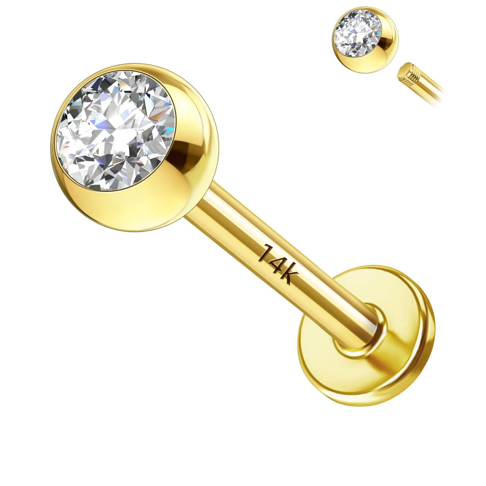 Designfy 14k Yellow/White Gold Body Jewelry Earrings for Women Threaded Micro CZ Gem Top Tragus/Helix/Labret Stud 16G 6mm 8mm