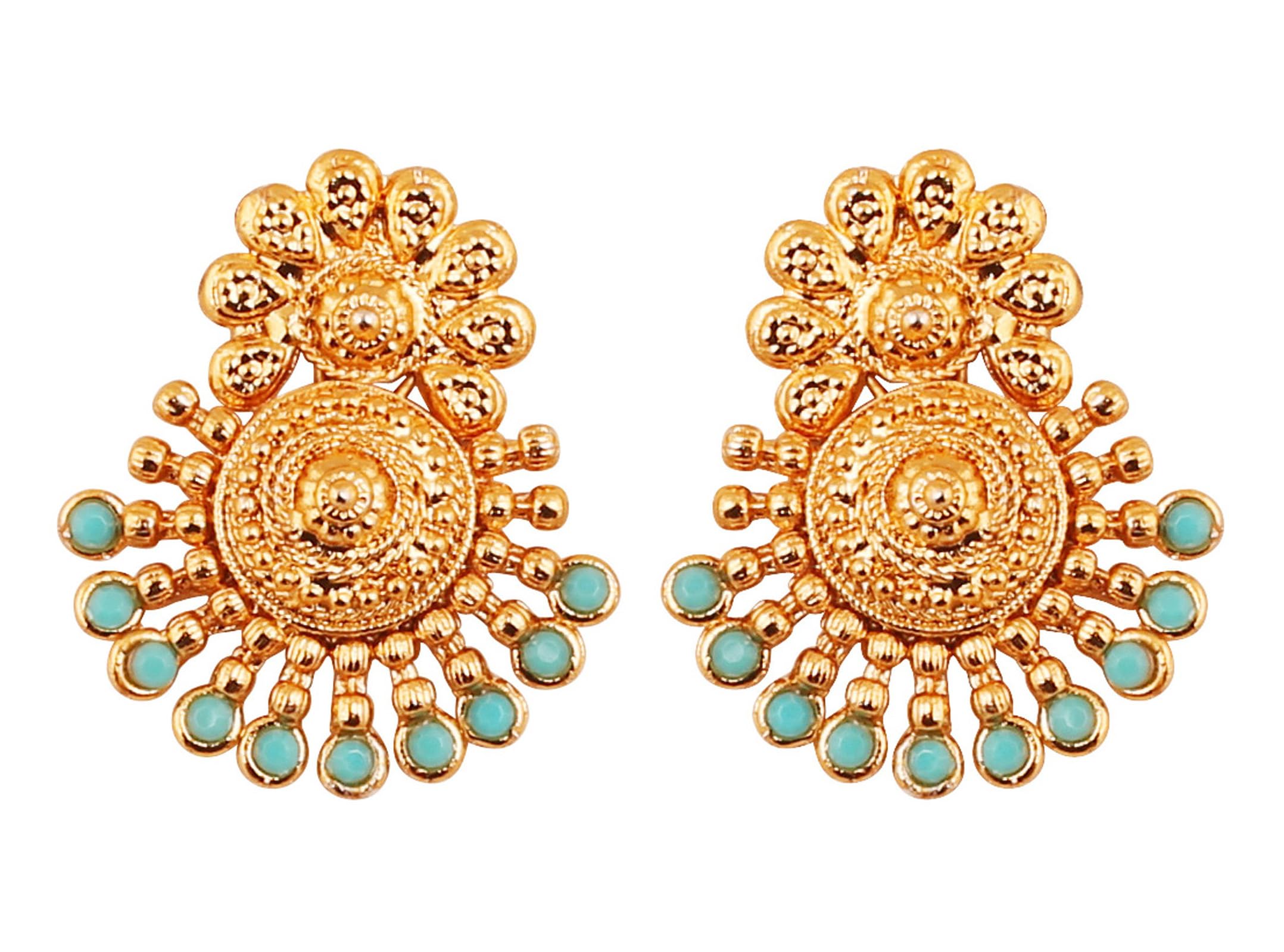Touchstone Indian Bollywood Ancient Southern Gold Bahubali Inspired Bridal Traditional Jewelry Earrings Embellished With Faux Turquoise For Women In Antique Gold Tone. SPECIFICATIONS : Earring weight (single) 11 gms.. Earrings length 1.50 inches. Earrings Width 1.25 inches. This is in a special dark