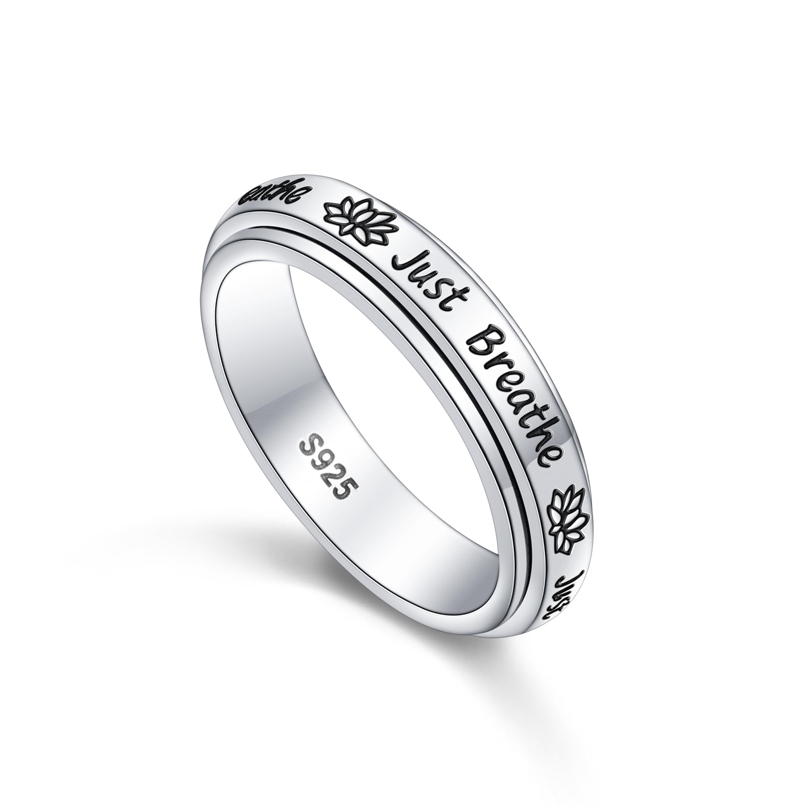 ❤DESIGN - SPINNER RINGS FOR ANXIETY: Spinner design with lotus flower and engraved ‘’Just Breathe", which will get you through stress and help you reduce anxiety to enhance your mood ❤MATERIAL - This sterling silver anxiety rings for women is made of real 925 sterling silver, engraved with
