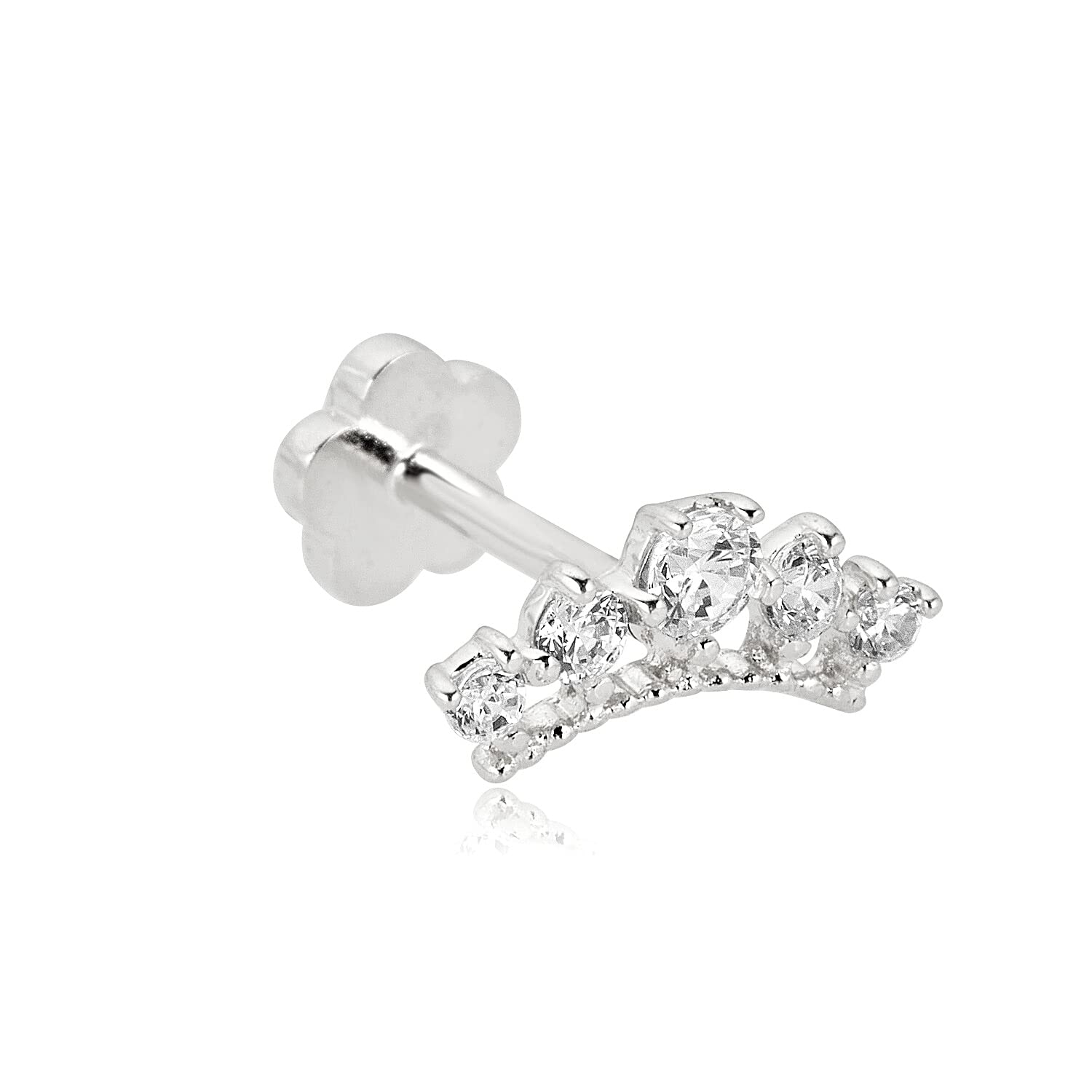 She would love how this glistening cartilage piercing/flat back earring lends her outfit just the right amount of sparkle. Crafted in 018-gauge 14K White Gold, this crown design is lined with glimmering Simulated Diamond Cubic Zirconia (CZ) accents. Includes a flower internally threaded backing in a
