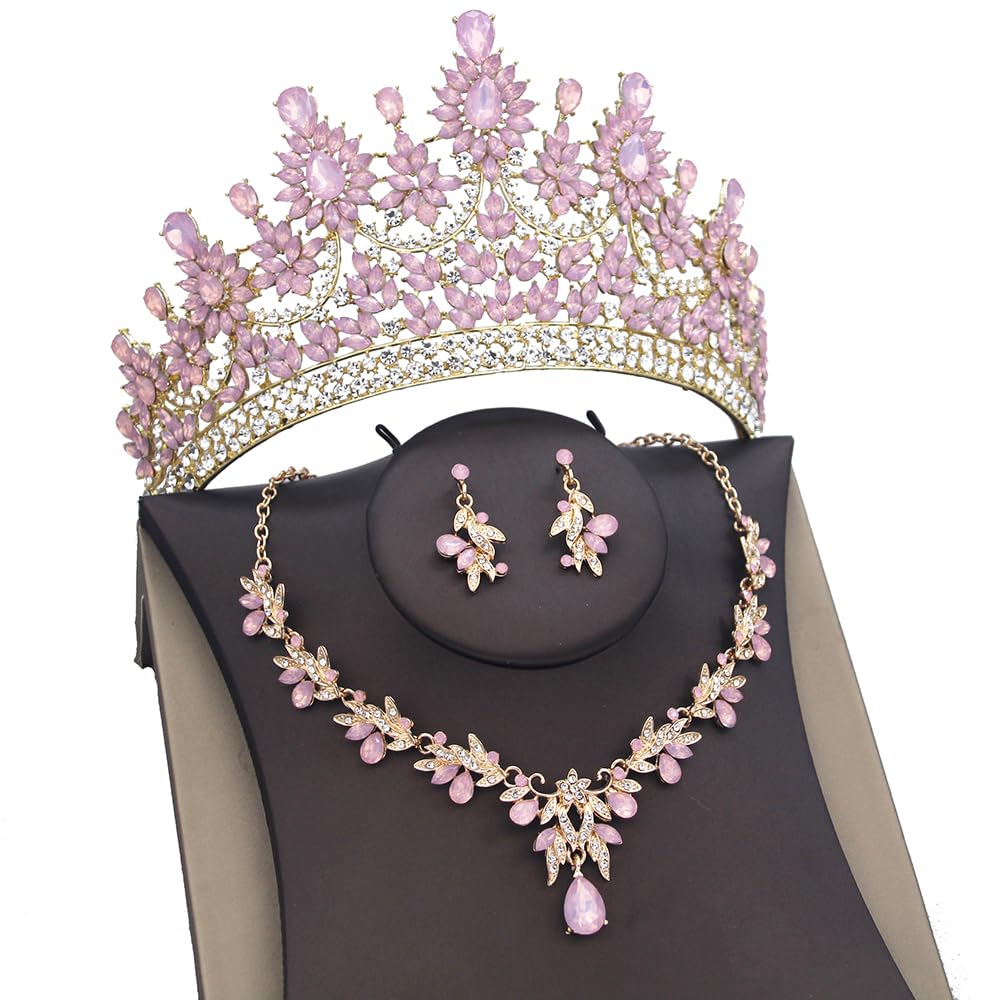 Bridal wedding tiaras set Vintage-style bridal jewelry collection featuring a majestic tiara crown, matching necklace, and drop earrings adorned with pink crystal rhinestones in gold-plated settings Gold-plated rhinestone crystal tiaras and jewelry sets for women headpiece jewelry Tiaras and crowns