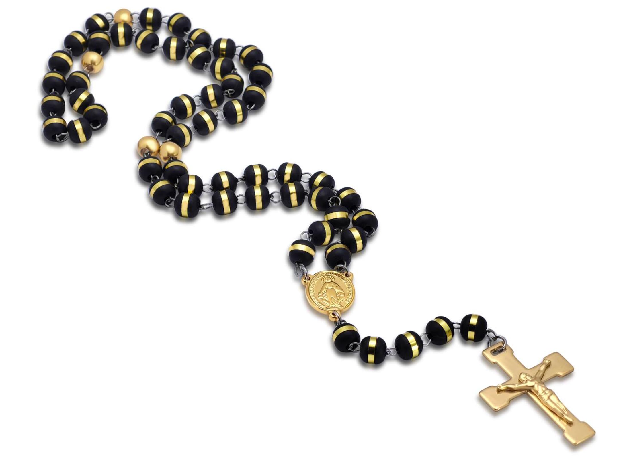 JAJAFOOK Mens Black Stainless Steel Black Gold Silicone Beads Rosary Necklace with Cross Pendant