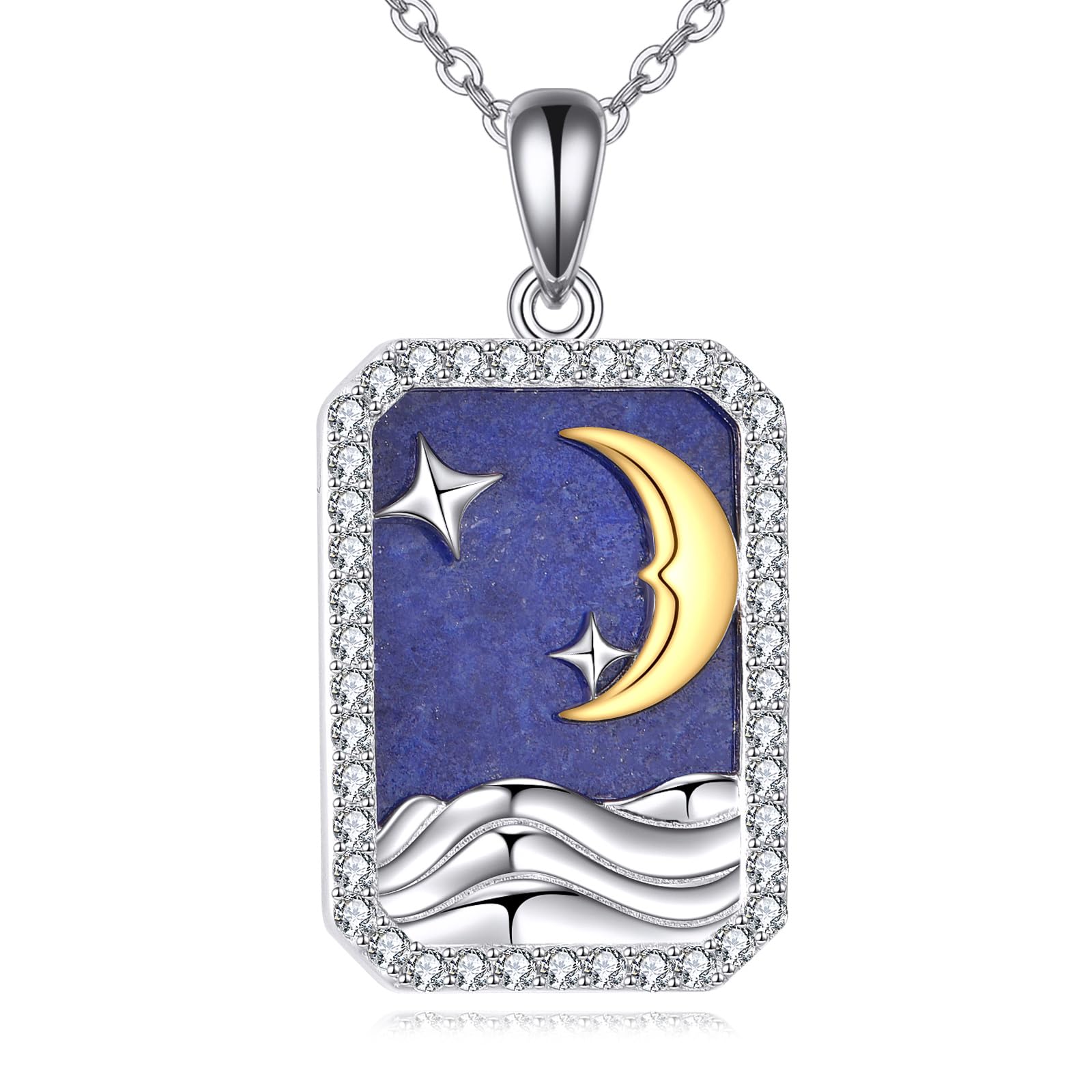 Unique Moon and Star Design: This elegant moon necklace featured a moon, star and wave. Embellishe with genuine lapis lazuli stone. And decorated with sparkly zircon making it more attractive. You could see the beautiful gold shiny in the blue stone like a starry night. Moon Pendant Measurement: Siz