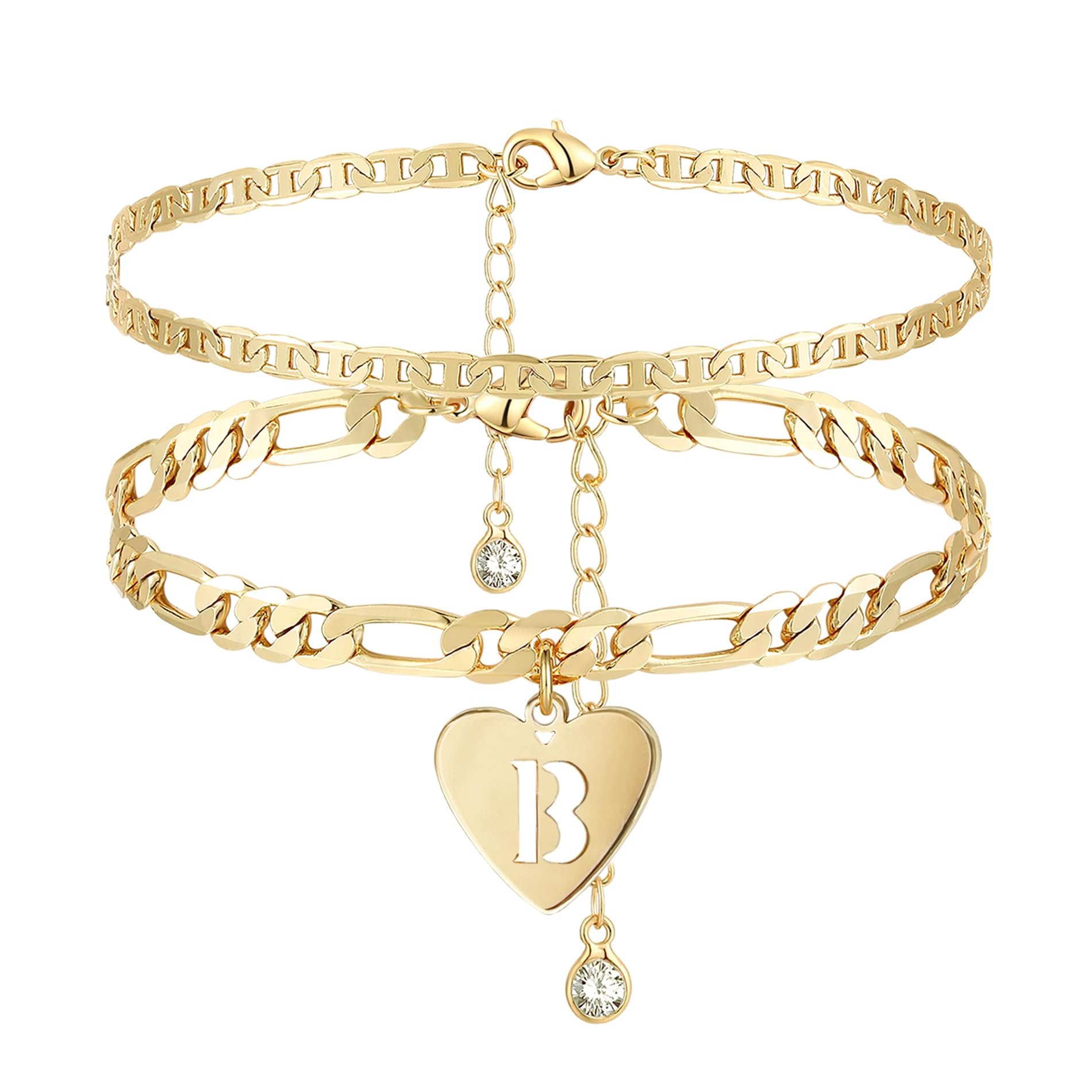 Initial Ankle Bracelets for Women: The gold ankle bracelets for women feature a multilayered design that creates a unique and stylish look for your ankles. This set includes a marina anklet and a Figaro letter anklet adorned with dainty heart-shaped initial pendants. Summer ankle bracelets for women