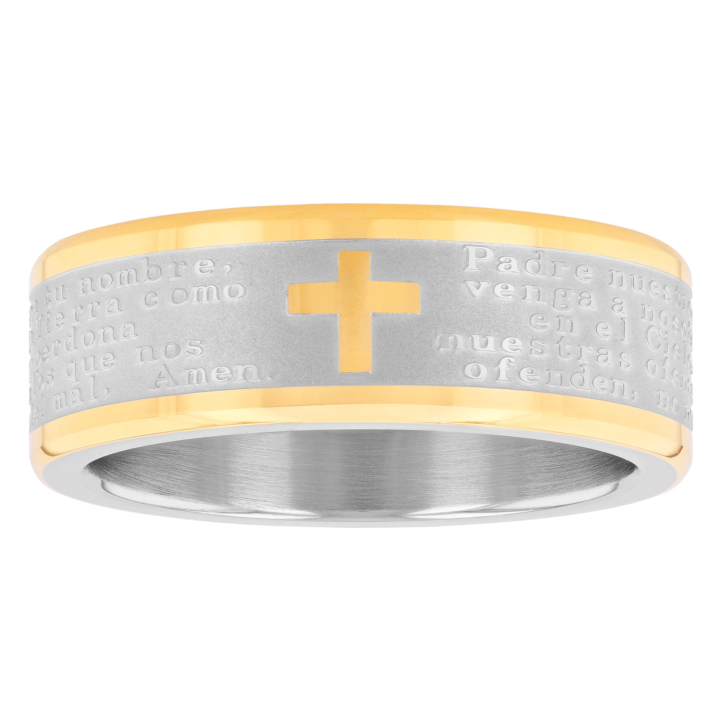 FAITH IN STYLE : This men's stainless steel band features a warm yellow gold finish, offering a stylish and sophisticated look. The inner surface is inscribed with the Lord's Prayer in Spanish ("Padre Nuestro"), providing a constant reminder of faith. The 8mm width provides a comfortable and masculi