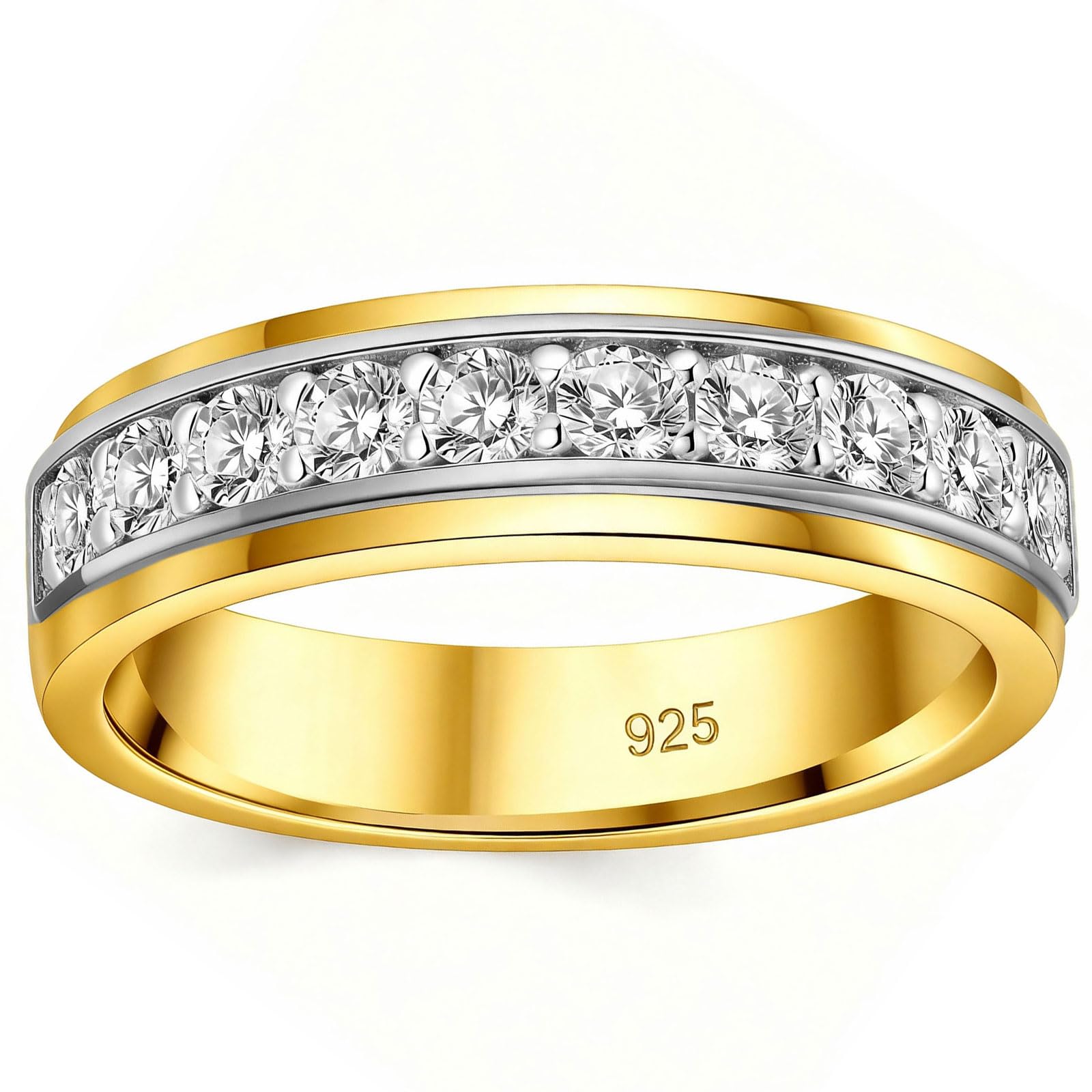 【Good Quality 】: This mens gold wedding band is made of 925 sterling sliver and 11 round high-quality CZ stones. The stones are carefully selected and set in a durable and long-lasting wedding band that is designed to withstand daily wear and tear. Total weight: 5.67g, 6.0mm width. Total stone w