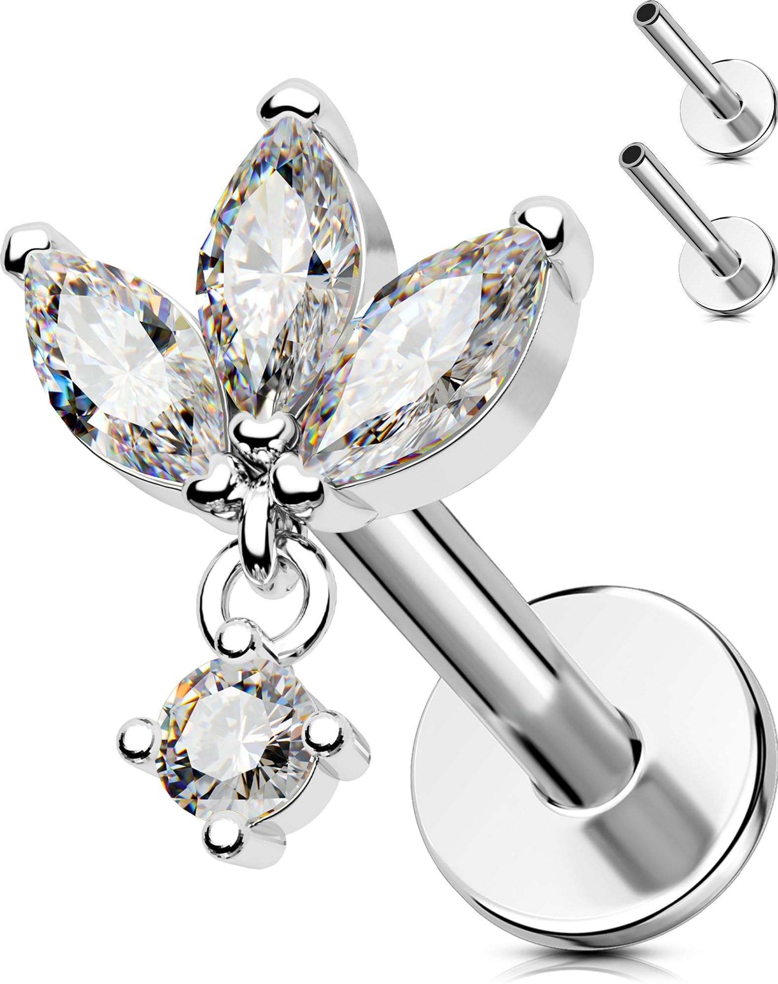 Sparkling Lotus & Dangling Zircon Cartilage Jewelry: This exquisite body jewelry features a dazzling lotus flower design with brilliant zircon stone accents and a delicate dangling round zircon charm, perfect for helix piercings, conch piercings, tragus piercings or lobe piercings. The elegant desig