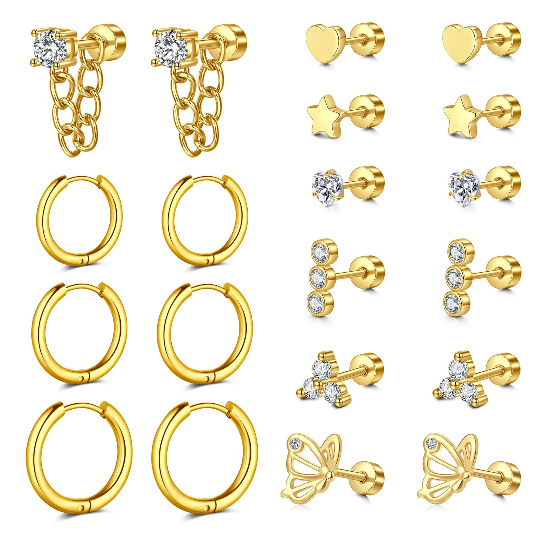 Package including -- 7 pairs flatback stud earrings for cartilage tragus helix piercing jewelry, 3 pairs cartilage hoop earrings for women Material -- Hypoallergenic stainless steel & Clear AAAAA+ Shiny Cubic Zirconia, allergy free and anti-rust, suitable for sensitive body Gauge: cartilage earring