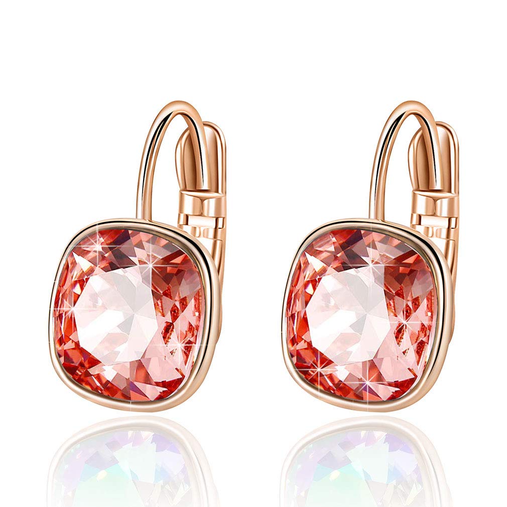 Austrian Crystal Square Cushion Drop Leverback Earrings for Women 14K Rose Gold Plated Hypoallergenic Jewelry