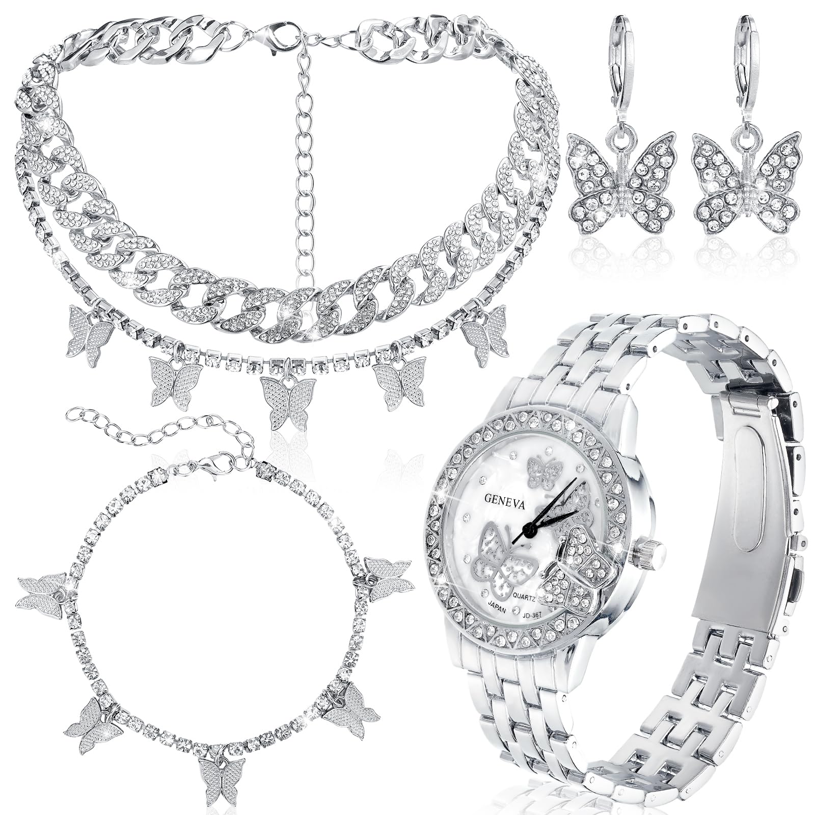 Versatile Jewelry Set: get ready to make a style statement with this hip hop jewelry for women that comes with 4 distinct pieces, including 1 necklace, 1 bracelet, 1 butterfly rhinestone watch, and butterfly rhinestone earrings; This varied set allows you the freedom to mix and match or alternate st