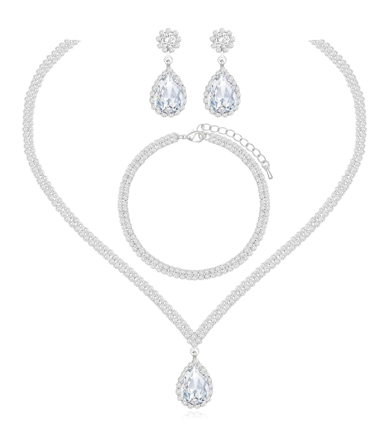 chaoyite Elegant Silver Crystal Wedding Necklace Earrings Bracelet Jewelry Set for Women Brides Bridesmaids Prom Party Costume Accessory Bridal