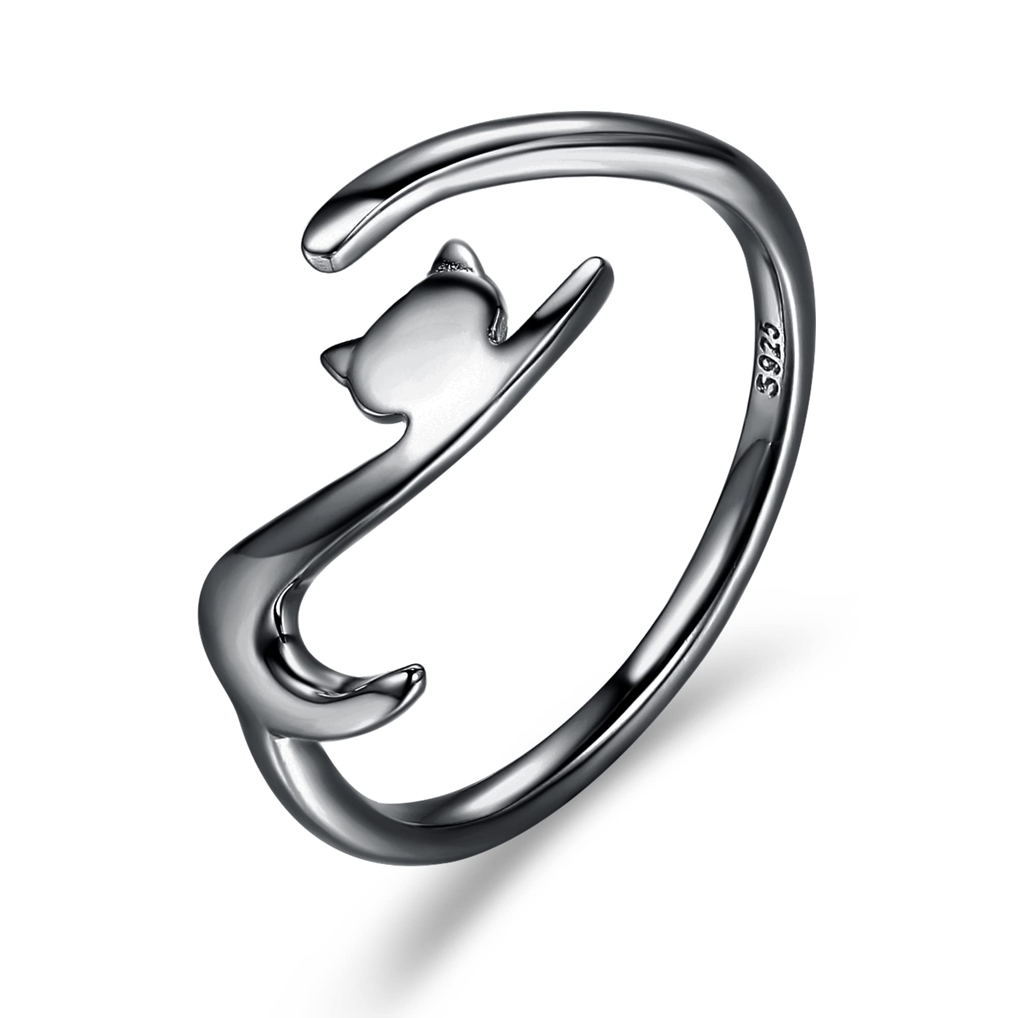 ❤【CREATIVE DESIGN】: The delicate and lovely cat pose gives the ring more fun. It's like a slimy cat wraps around your fingert and teases you all the time. ❤【PREMINUM MATERIAL】: This black cat ring is made of 925 Sterling Silver and Black Gold Plated. Delicate and shiny texture. Hypoaller