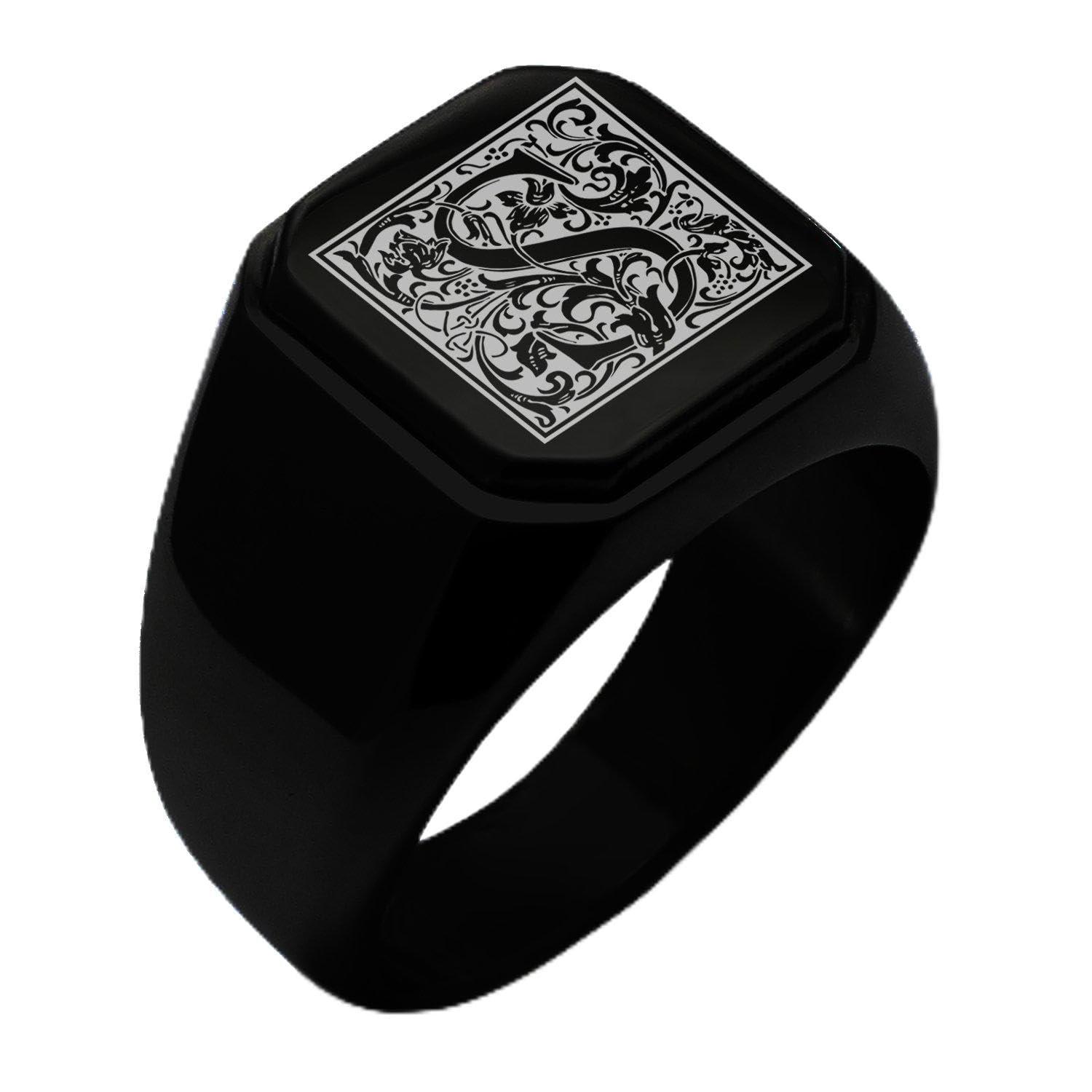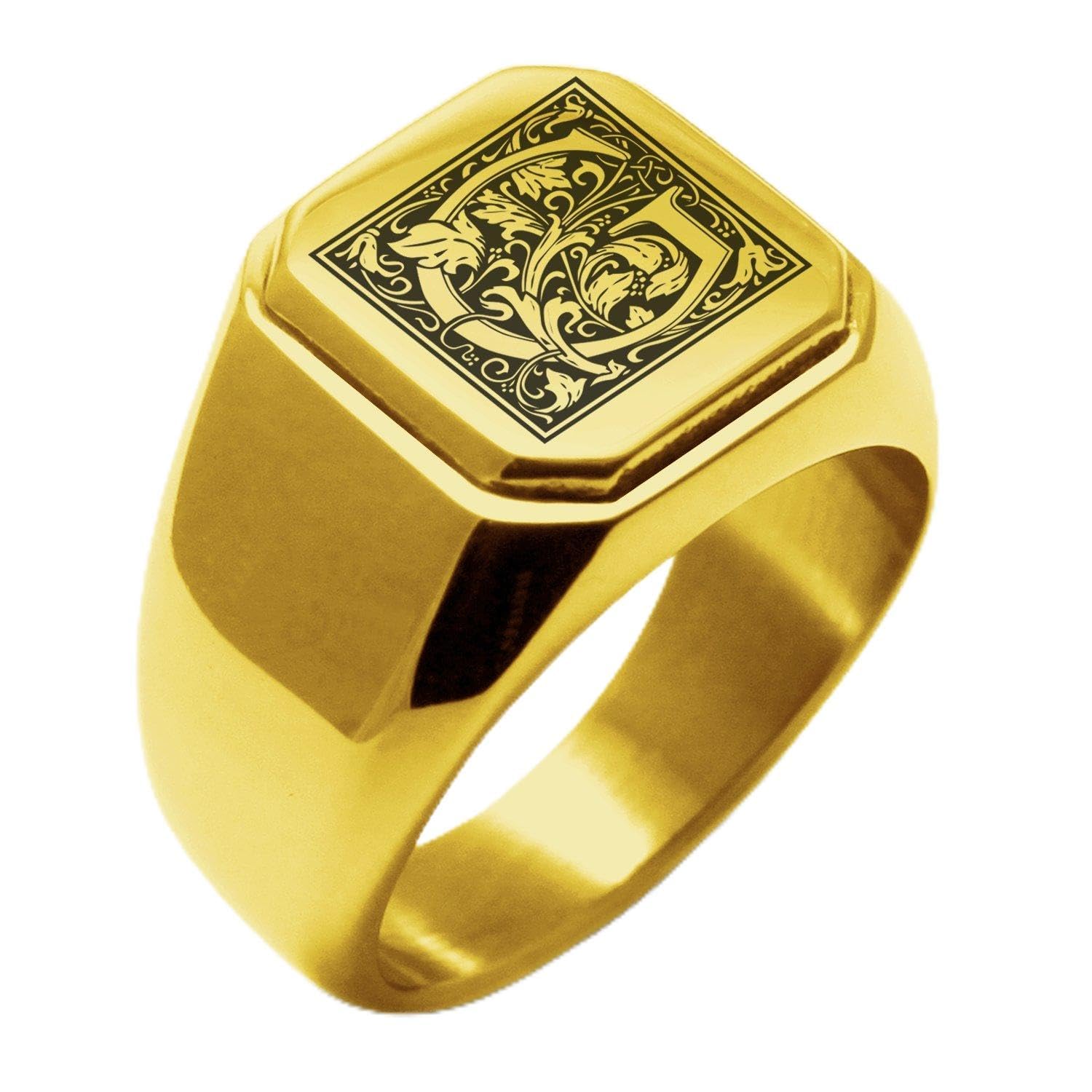 Tioneer Jewelry | Stainless Steel Letter Alphabet Initial Ring | Square Flat Top Ring for Men & Women | Stainless Steel Jewelry, (Black, Gold, Silver)