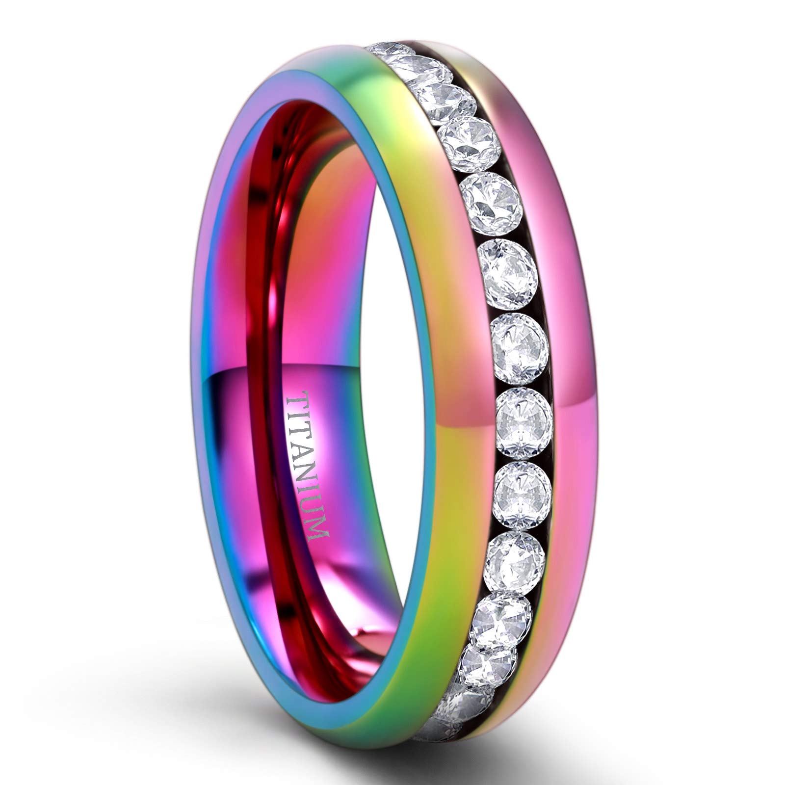 This wedding band is expertly crafted from genuine titanium and is available in four different widths: 4mm, 5mm, and 6mm. It comes in a variety of stylish colors, including silver, rainbow, and black Its sparkling yet simple style makes it perfect for stacking or wearing separately, allowing you to