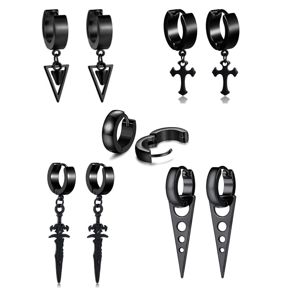5 Pairs Punk Hip-hop Stainless Steel Black Dagger Geometric Triangle Cross Sword Dangle Surgical Huggie Hoop Earrings Set Gift for Men Women Teen