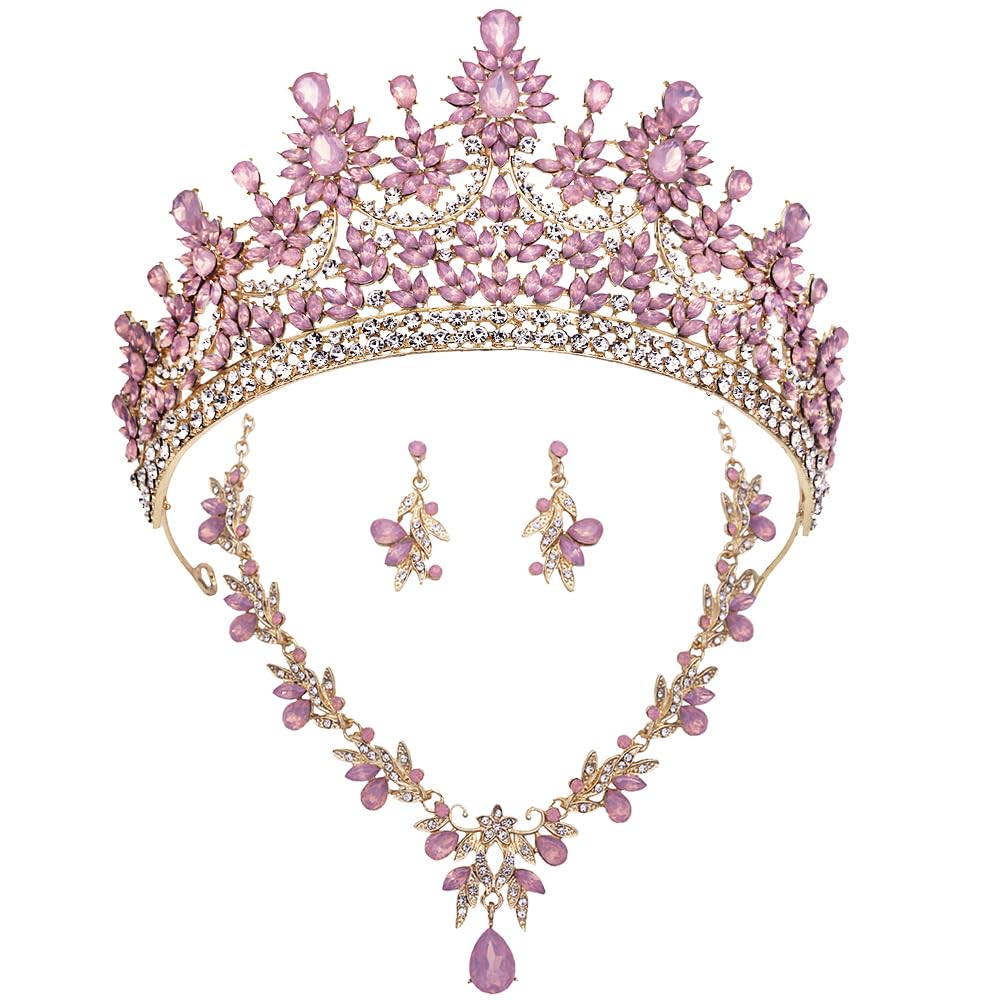 Bridal wedding tiaras set Vintage-style bridal jewelry collection featuring a majestic tiara crown, matching necklace, and drop earrings adorned with pink crystal rhinestones in gold-plated settings Gold-plated rhinestone crystal tiaras and jewelry sets for women headpiece jewelry Tiaras and crowns