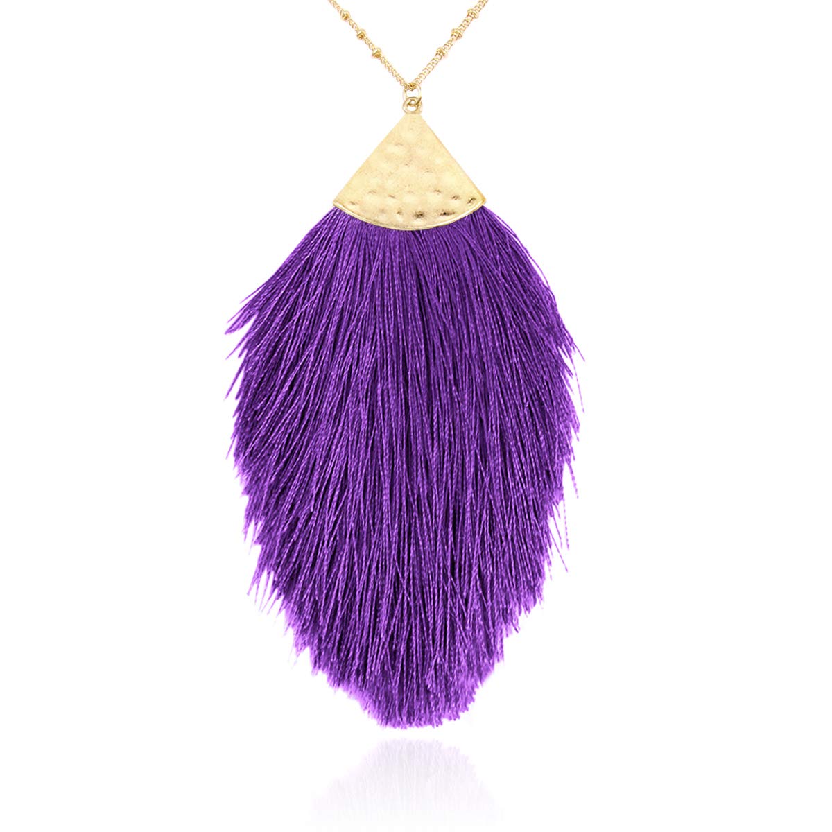 RIAH FASHION Antique Bohemian Silky Thread Fan Tassel Statement Necklace - Vintage Gold Feather Shape Strand Fringe Lightweight Long Chain