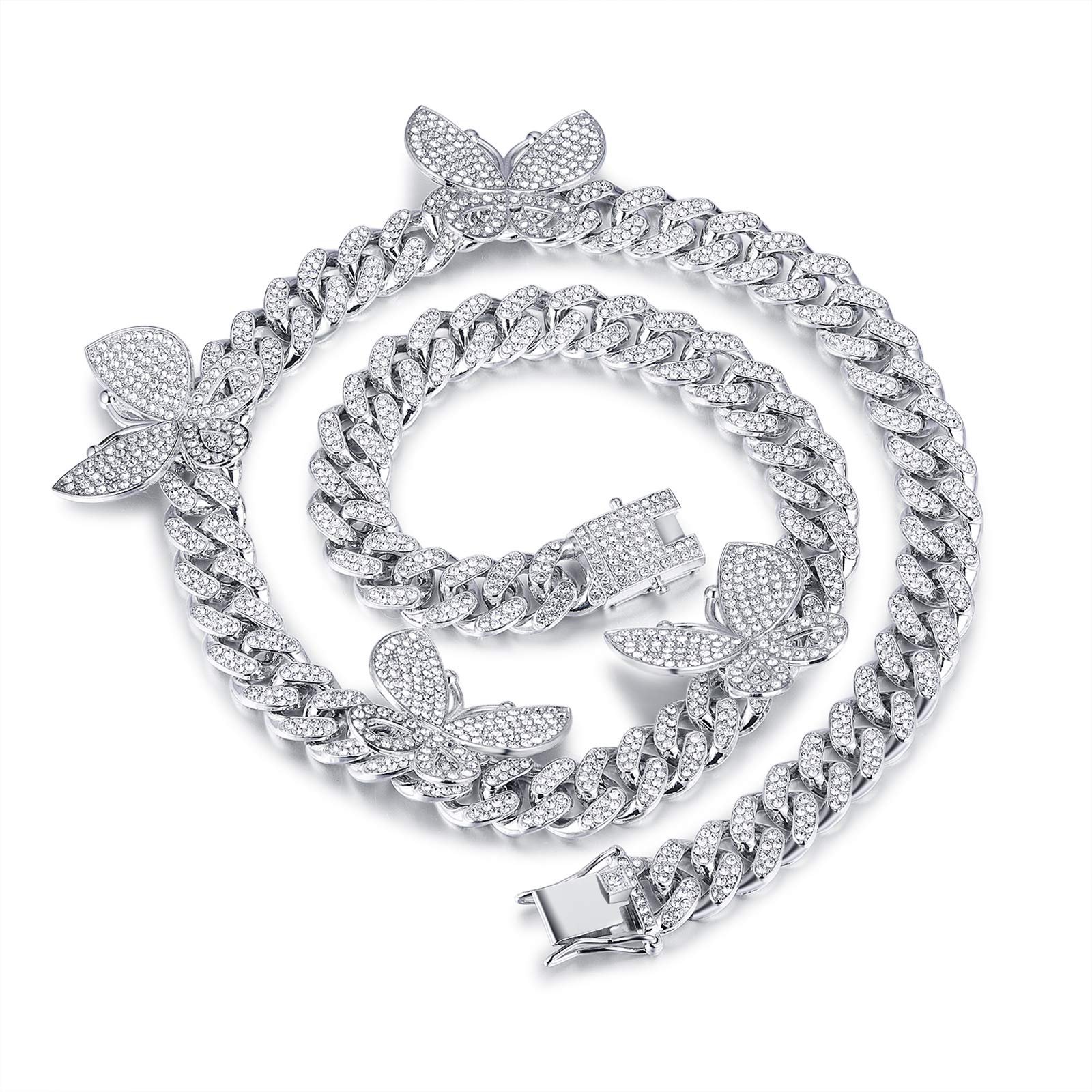 YBMYCM Butterfly Cuban Necklace Crystal Collars Cuban Link Chain Iced Bling Butterfly for Women Men Hip Hop Rapper Jewelry