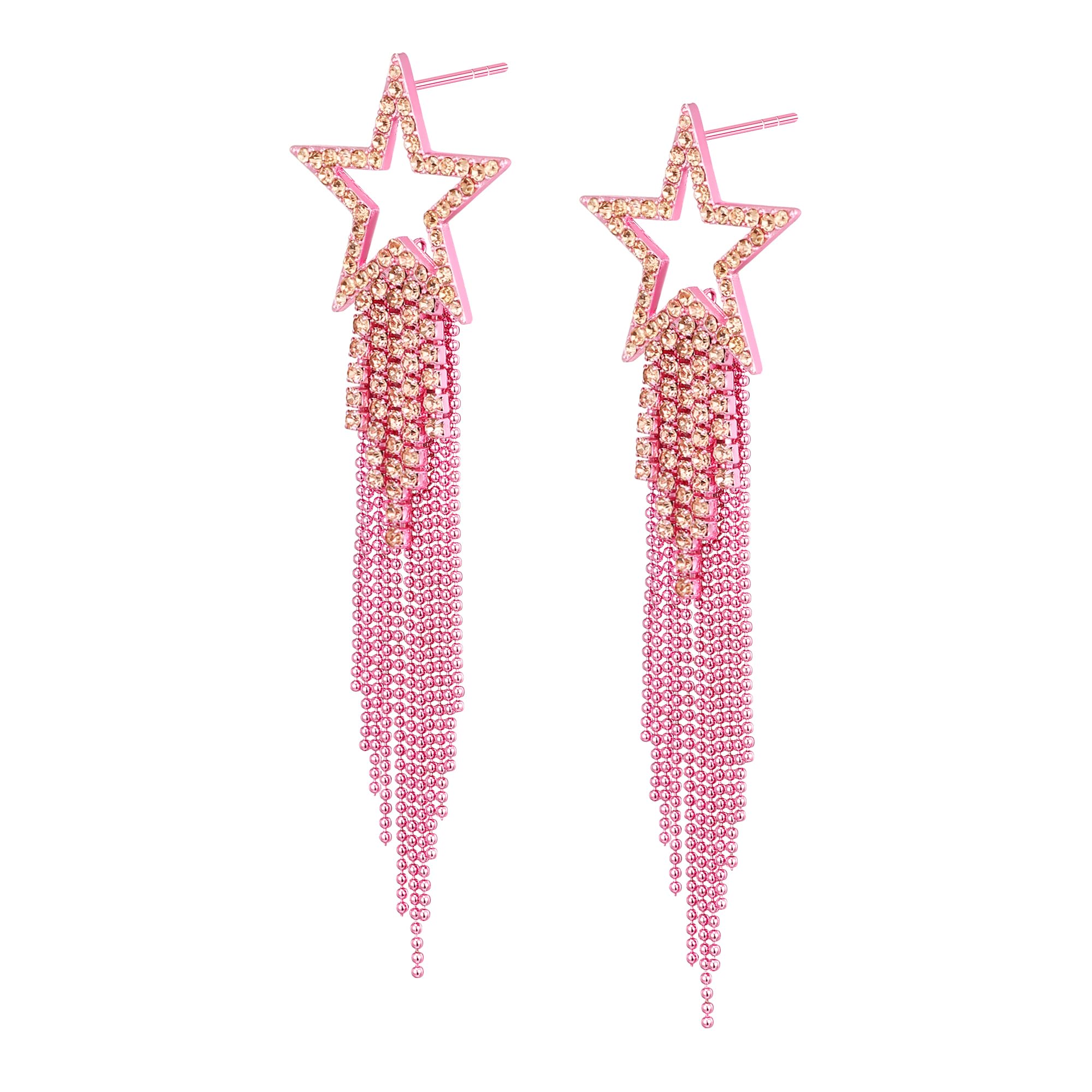 Gorgeous long tassel chandelier dangle earrings for wedding or party. It features sparkly rhinestone paved hollow star ear studs which will make a timeless accessory to any jewelry collection. These lightweight ear studs double layered tassel earrings can be worn with classy casual or formal attire.
