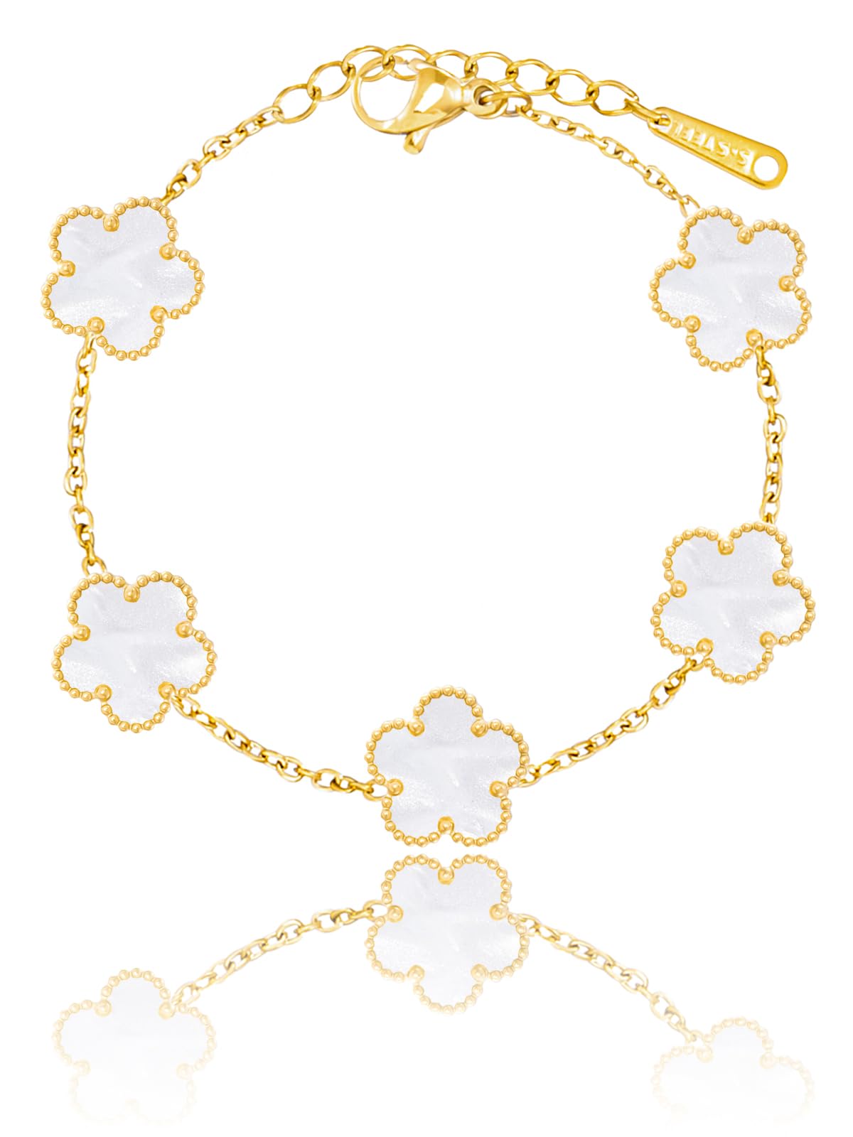 A Four Leaf Clover Bracelets. These Luck Flower Shaped Jewelry Bracelet Measure 0.52" High 0.5" Wide, 7 + 2 inch Chain. The Weight of These Dainty Bracelets is 9g. These Formal Bracelets Feature Five 11*11mm AAA+ Chalcedony. Hypoallergenic and Nickel free. Gorgeous for Bridesmaids, Prom, Homecoming,